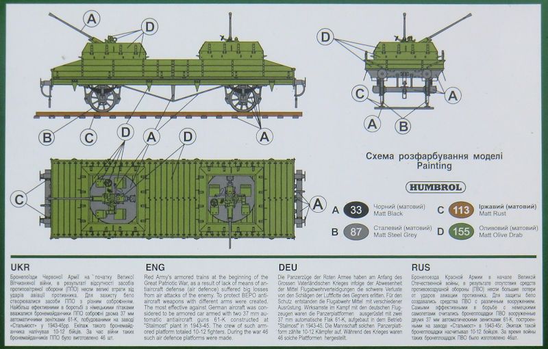 Vorbild: Nach den großen Verlusten, die die sowjetischen Panzerzüge zu Beginn des Ostfeldzuges erlitten, wurden provisorische Mittel zur Flugabwehr entwickelt. Auf einen normalen Plattformwagen wurden zwei leicht geschützte Drehstände für die 37mm-Flak 61-K aufgebaut.