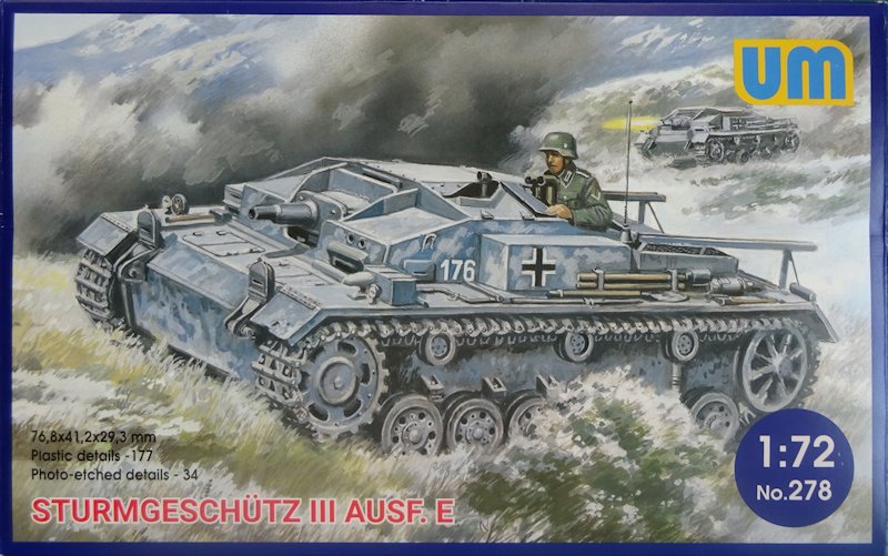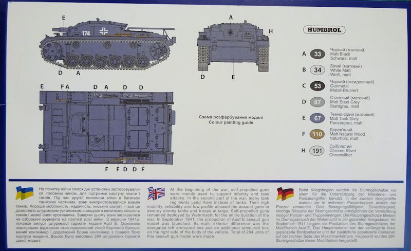 Vorbild: Das Sturmgeschütz III Ausf. E wurde ab September 1941 (insgesamt 298 Fahrzeuge) als Zugführer- und Batteriechefgeschütz gebaut, d.h. man benötigte mehr Platz für Funkgeräte. Das Sturmgeschütz war mit einem 10 Watt Sender und zwei UKW Empfängern mit einem Lautsprecher ausgerüstet. Die linke Aufbauseite der Version A-D wurde nun auch an der rechten Seite angebaut. Dadurch ergab sich auch die Möglichkeit 6 Schuss Munition mehr unterzubringen. Die Kampfbeladung betrug jetzt 50 Patronen. Die Ausführung E war das letzte Sturmgeschütz, das serienmäßig mit der kurzen 7,5cm KwK L/24 ausgerüstet war.