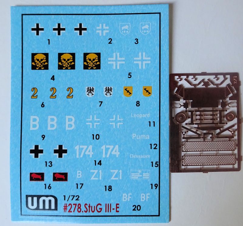Bausatz: In der typischen Schüttbox von UM befinden sich fünf hellgraue Gießäste, eine kleine Platine mit Fotoätzteilen, der Abziehbilderbogen und die Bauanleitung. Die Bauanleitung führt in 19 Schritten zum fertigen Modell, ist aber etwas unübersichtlich, da zu viele Teile in einem Bauabschnitt dargestellt werden. Alle Teile sind gut detailliert dargestellt, es müssen aber ein paar Grate entfernt werden.