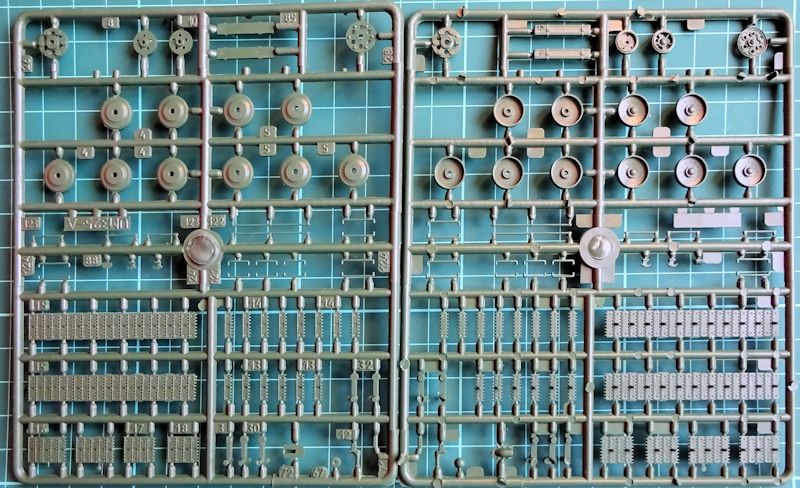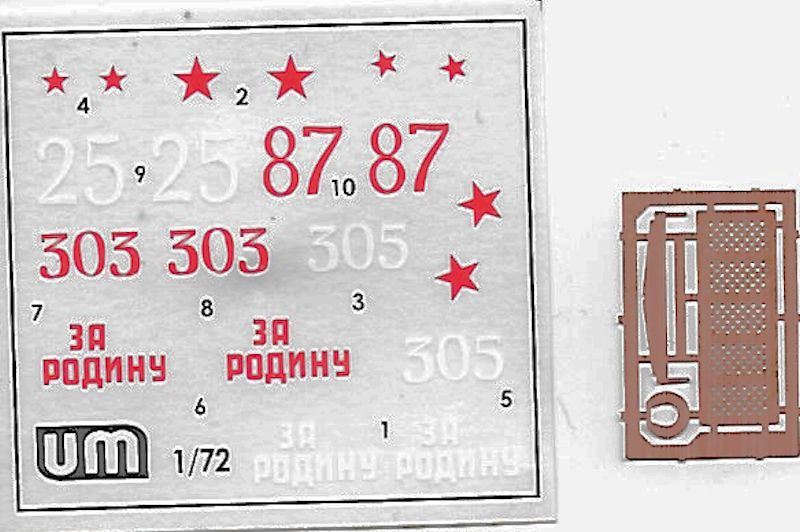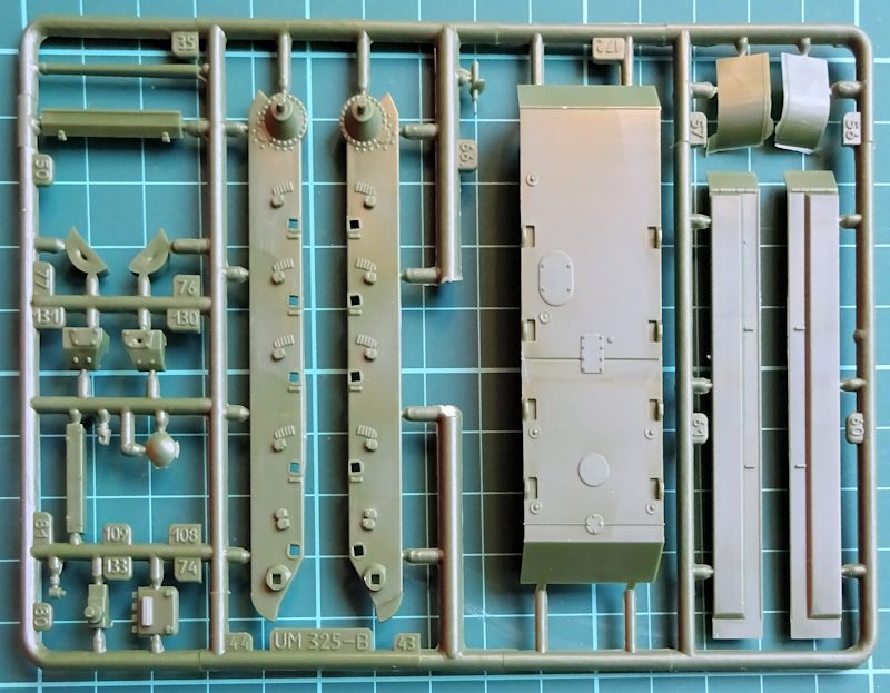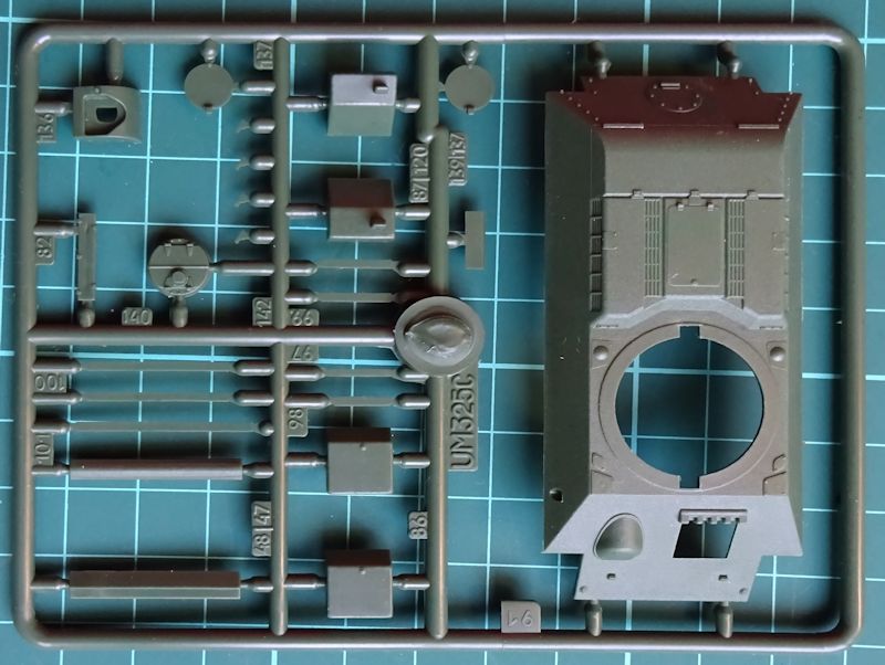 Bausatz: Von UM gibt es den Bausatz des T-34 in verschiedenen Ausführungen schon seit über zehn Jahren. Damit sind die vier sauber wiedergegebenen grünen Giessäste, die zwei schwarzen Gummiäste und der kleine Ätzteilesatz alte Bekannte. Alle Teile sind sauber und Gratfrei wiedergegeben. Die Struktur aller Oberflächen ist gut detailliert wiedergegeben.