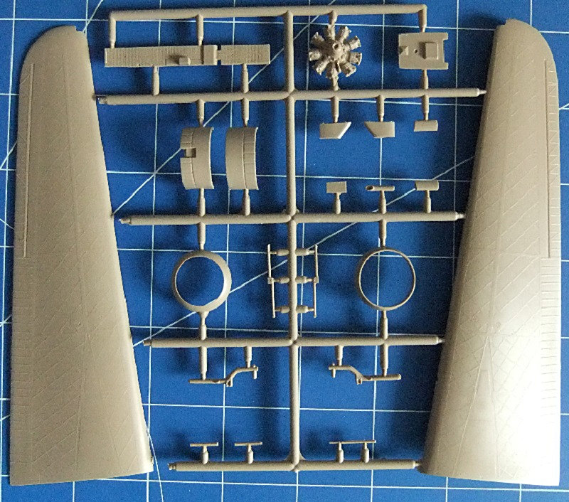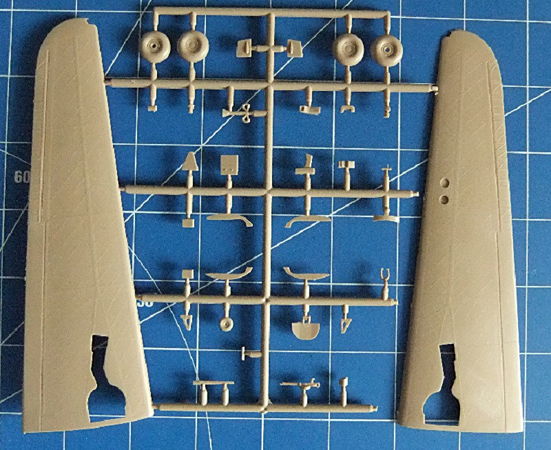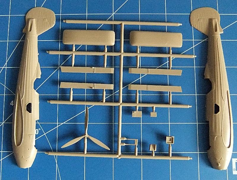 Der flache Stülpkarton enthält vier Spritzrahmen mit insgesamt 84 Teilen aus braunem Kunststoff, ein Rahmen mit 10 Klarsichtteilen und eine Platine mit einer hohen Anzahl an Messingätzteilen. Dazu kommt noch ein kleiner Film für die Instrumentenbretter, die Decals sowie eine farbig gestaltete Bauanleitung in Heftform, deren Zeichnungen aber stellenweise etwas unpräzise erscheinen. Dies trifft besonders auf den Einbau des Fahrwerkes zu. Hier sollte sorgfältig geprüft werden ob der Einbau so überhaupt machbar ist.
