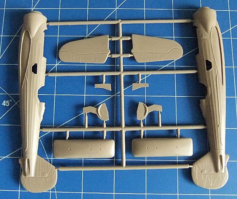 Die Pilotenkanzel liegt dem Bausatz einmal in geschlossener, sowie dreiteiliger Ausführung für eine geöffnete Kabine bei. Natürlich fehlen auch die beiden Bombencontainer unter den Flügeln nicht.