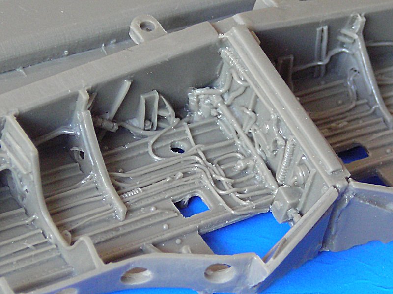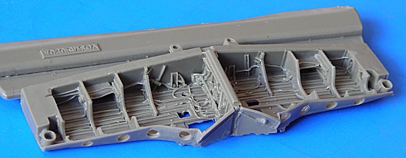 Die Detaillierung der Teile ist sehr gut und der Guss ist ebenso hervorragend. Das Material entspricht in de Konsistenz etwa dem von Aires bekannten dunkel-grauen Material. Es riecht ähnlich und läßt sich sehr gut sägen. Eine Bauanleitung liegt nicht wirklich bei. Eine Skizze zeigt lediglich den jeweiligen Einbaupunkt der Kleinteile. Allerdings gibt es Hinweise für das Ausdünnen des Plastikflügels. Für die Farbgebung der Details ist man auf zusätzliche Literatur angewiesen, auch dazu gibt es keine Hinweise.