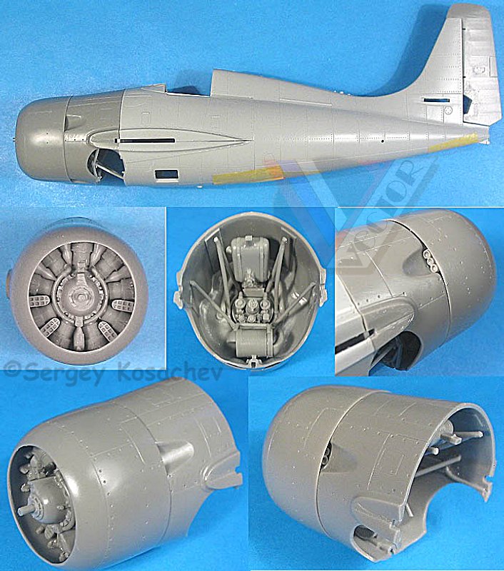Hauptproblem ist der vordere Motorbereich. Die FM-2 hatte einen neuen Motor eingebaut, was dazu führte, das die Wildcat bei gleicher Länge eine kürzere Motorhaube und einen etwas längeren Rumpf hatte. Außerdem ist die Motorhaube etwas größer im Durchmesser und hat einen größere Öffnung an der Front. Dazu kommt dann noch der neue Motor. Die "Dellen" für die Auspuffleitung sind ebenfalls nicht ganz an der richtigen Stelle. Als Konsequenz gibt es von Vector einen komplett neuen Vorderrumpf aus Resin. Dabei ist gleich die richtige Tonnenform abgegossen, so dass man diese nicht aus zwei Hälften zusammenbauen muss. Allerdings sollte man etwas Vorsicht beim Abtrennen insbesondere des Angusses der Motorhaube, walten lassen. Die Kontaktflächen sind jedoch sehr dünn uns lassen sich schon mit dem Skalpell durchtrennen .. aber wie gesagt: VORSICHT!