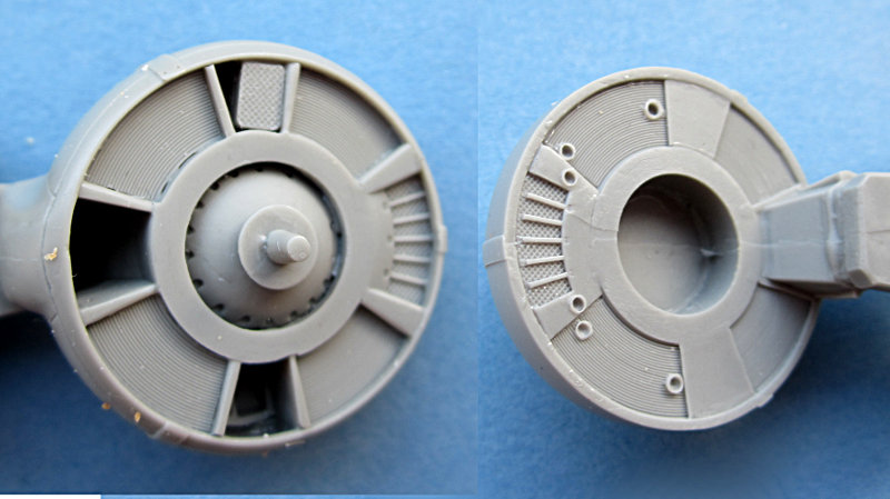 Hervorragend ist auch der Kühler ausgeführt. Dieser ist auf der Vorder und Rückseite detailliert und daher lohnt es sich auch die separat beiliegende Kühlerklappen geöffnet darzustellen. Schließlich sind auch neue Abgassammler im Satz enthalten. Diese sind sehr schön filigran und natürlich an den Abgasdüsen hohl ausgeführt. Die Verpackung ist allerdings für die Dauerhaftigkeit dieser Details nicht förderlich.