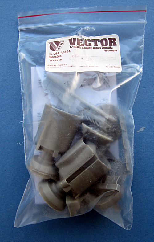 Für die Ju88A-4/A-14 Bausätze von ICM (First Looks: Ju 88 A-14, Revell Ju 88 A-4) hat Vector diesen Korrektursatz herausgebracht. Wie immer in der etwas lieblosen Plastiktüte erhält man einen Supersat zur Korrektur der Motorgundeln. Die Form der Beule unter dem Motor ist toll getroffen. Hier finden sich bei meinem Exemplar allerdings einige Bruchlinien von der Form die verspachtelt und verschliffen werden müssen.