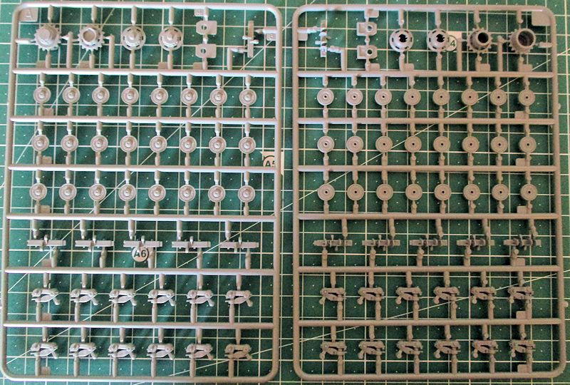 Die Ketten sind sehr gut detailliert wiedergegeben. Als Segment und Einzelgliederketten. Was mir sehr gut gefällt ist das die Einzelglieder leicht gebogen sind so dass sie besser um das Antriebs- und Leitrad passen. Die Ketten beziehen sich auf die Maus, die in Kubinka steht. Zwei Gießäste entfallen allein auf das Laufwerk, welches sehr gut detailliert ist. Ein Rollwagen besteht aus sieben Teilen, an den Laufrollen sind die Bohrungen zu sehen die das Gummipolster der Laufrolle an Ort und Stelle halten sollten.