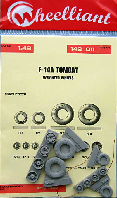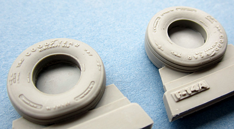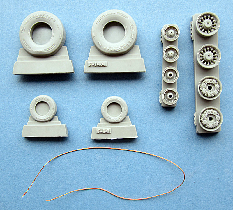 Die Details der Resinteile sind sogar noch etwas schärfer als die von Eduard/Brassin. Auch hier sind die Reifen abgeflacht sowie leicht ausgebeult und die Felgen separat, in diesem Satz auch für die Bugfahrwerksräder. Aires hat für die Bremsleitungen auch dünnen Kupferdraht beigelegt. Ausgelegt ist der Radsatz für die Verwendung an Academys F-14, daher wird man für andere Bausätze Anpassungen vornehmen müssen. Die Felgenhälften haben einen Zapfen auf der einen und eine Nut auf der anderen Seite, so dass sie ineinander greifen. Für die richtige Ausrichtung des Reifens zum Boden muss man jedoch selbst sorgen!