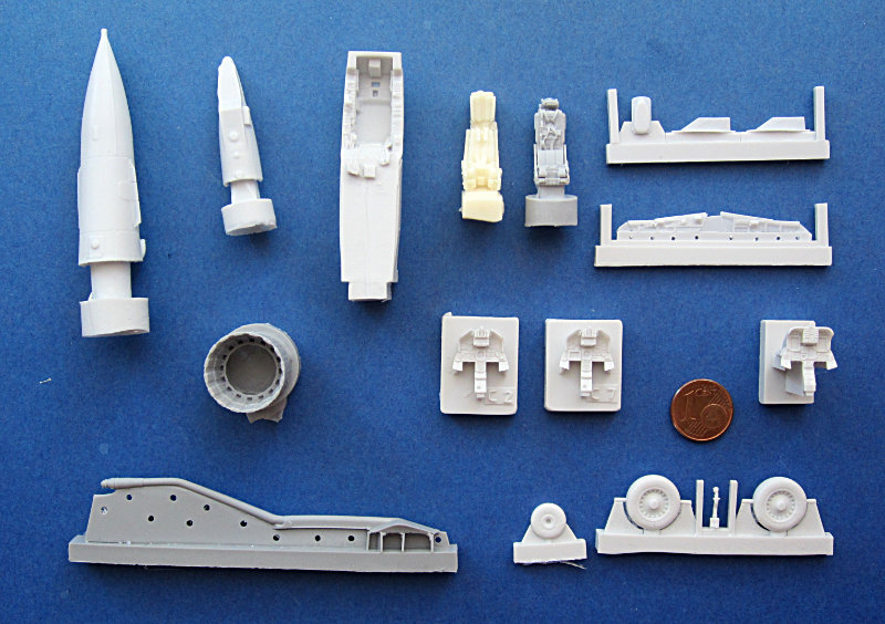 Bausatz: Wingman Models greift hier auf die Kinetic Plastikspritzgussteile zurück: Diese sind von ordentlicher Qualität, aber nicht immer passgenau. Erst der Bau wird hier zeigen was die Teile taugen. Hinzu kommen eine ganze Reihe von Resinteilen von IsraCast für Cockpit (zwei Schleudersitze, mehrere Instrumentenbretter für die verschiedenen Versionen), Schubdüse, Räder, Radarnase und Betanmkungssonde für modernisierte Versionen. Hinzu kommen Drehteile von Master für die Pitotrohre und Masken, die Eduard nicht ganz unähnlich scheinen.
