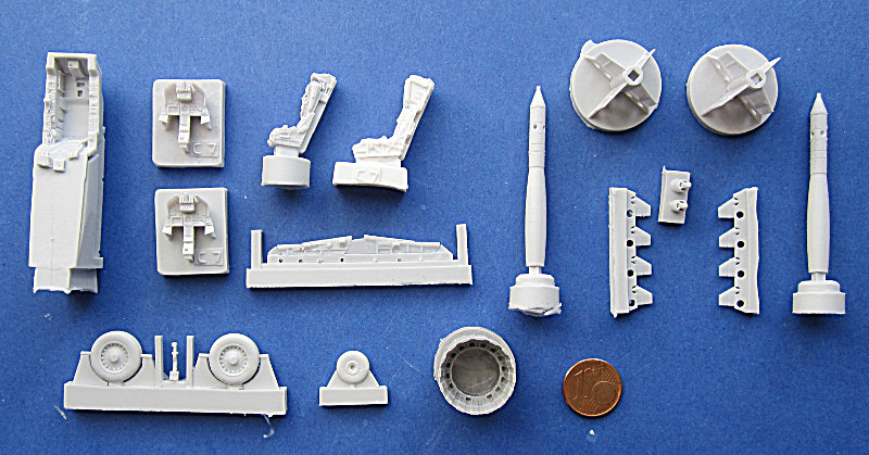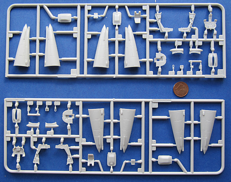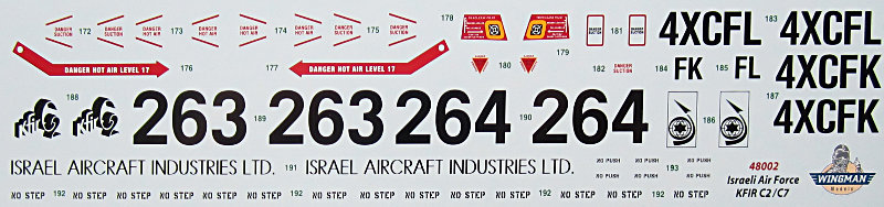 Bausatz: Wie schon bei der Edition mit den Lateinamerikanischen Kfirs greift Wingman Models hier auf die Kinetic Plastikspritzgussteile zurück: Diese sind von ordentlicher Qualität, aber nicht immer passgenau. Erst der Bau wird hier zeigen was die Teile taugen. Hinzu kommen eine ganze Reihe von Resinteilen von IsraCast für Cockpit (zwei Schleudersitze, mehrere Instrumentenbretter für die verschiedenen Versionen), Schubdüseuns zwei Bomben. Hinzu kommen Drehteile von Master für das Pitotrohr und Masken, die denen von RES-IM ähneln.