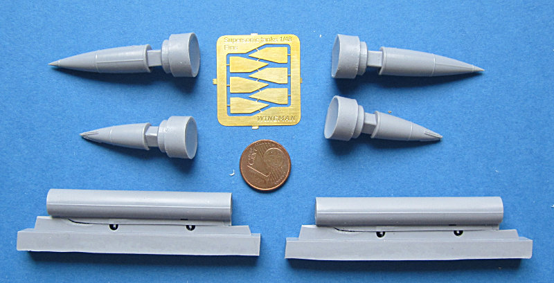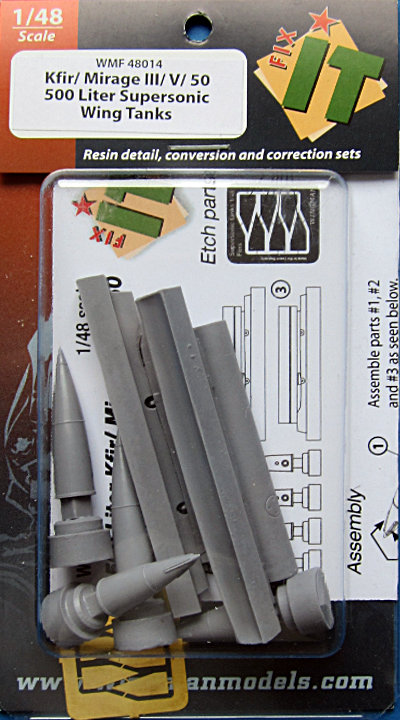 Wie schon in den Bausätzen angekündigt, bietet Wingman Models nun endlich Ersatztanks für die IAI Kfir von Kinetic bzw. deren eigenen reboxings "IAI Kfirs" und "Latin American Kfirs" an. Diese kleineren Tanks für 1000 Liter Treibstoff zum Einsatz oberhalb der Schallgeschwindigkeit ersetzen die unterdimensionierten Teile des Bausatzes. Diese Tanks wurden oft von der IAF verwandt. Der Guss ist gut und die Oberflächengestaltung ganz in Ordnung. Von der Aufteilung bin ich wirklich begeistert, da so fast keine Angüsse zu versäubern sind. Allerdings ist die Passgenauigkeit eher mäßig, so dass man stark auf die Ausrichtung der Teile achten und auch etwas nacharbeiten muss. Die PE-Finnen sorgen für Stabilität und trotzdem (halbwegs) maßstäbliche Materialstärke.