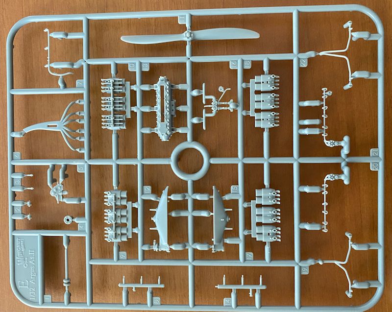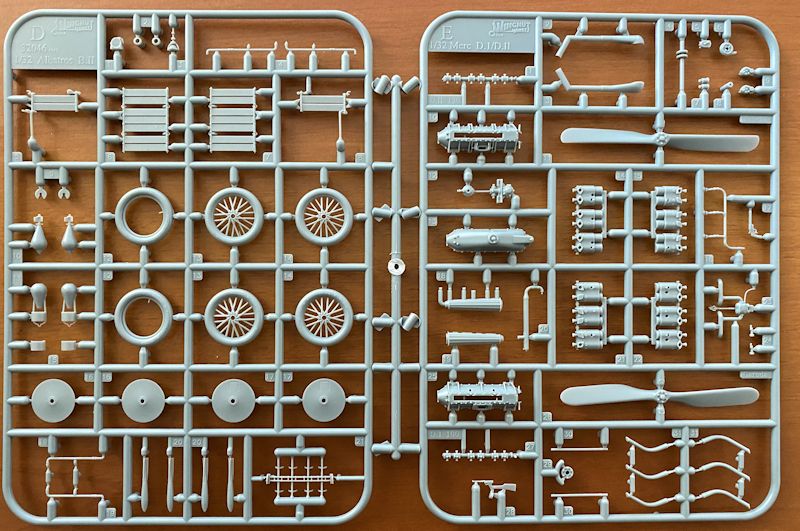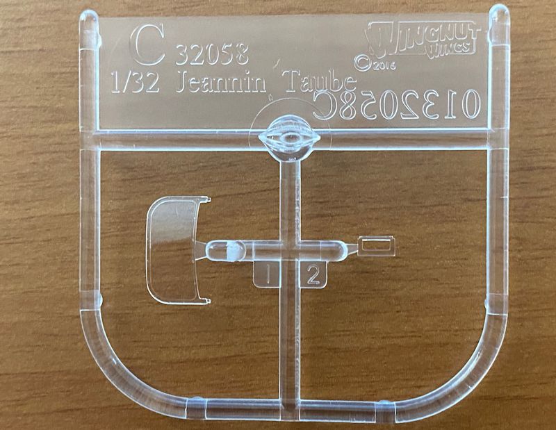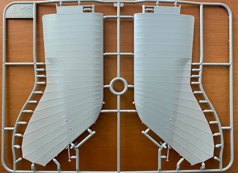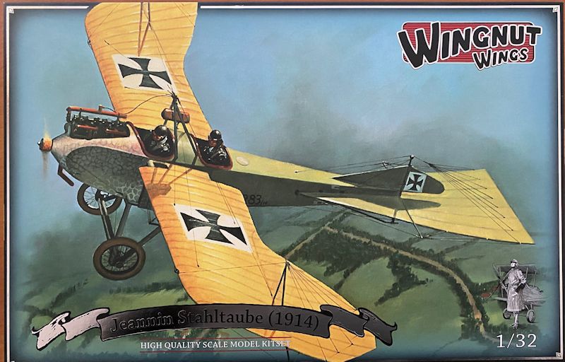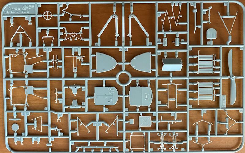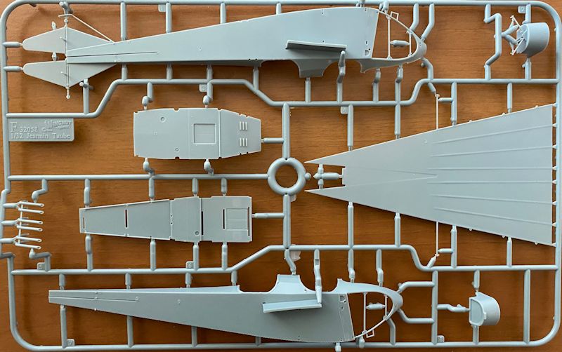 Bausatz: Der Karton ist stabil und von oben zu öffnen. Das Kartonbild ist wunderschön. Die 165 Teile für den Zweisitzer befinden sich an sechs grauen und einem klaren Gussast. Damit liegt die Taube im Mittelfeld der Angebotspalette von Wingnut Wings (WnW). An den Plastikteilen ist nichts auszusetzen. Insbesondere gefällt die unterschiedliche Materialstärke im Bereich der Flügel, die an ihren Enden immer dünner und filigraner werden.
