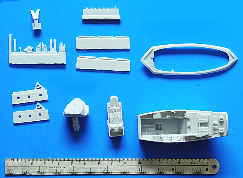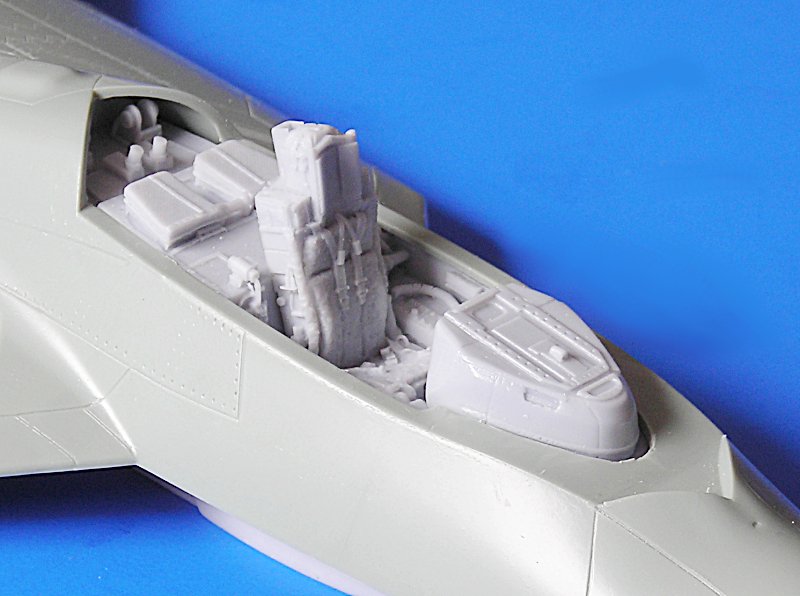 Das Cockpitset besteht aus einer großen "Wanne", Instrumententräger Schleudersitz und einigen Kleinteilen für die Haube und deren Verschlussmechanismus. Alle Teile sind sauber und blasenfrei in einem hellgrauen Resin gegossen, das sich gut mit der "Thin Blade Craft Saw" von Tamiya und der "Rasierklingensäge" von JLC trennen ließ. Eine Passprobe mit Fahrwerksschacht habe ich noch nicht durchgeführt .. hier kann es eventuell noch zu einem "Engpass" kommen. Die Abdeckung des Hauptgerätebrettes bzw, der Träger des HUD muss vom Bausatzteil abgetrennt und danach müssen einige Anpassungsschritte vorgenommen werden. Bei mir ist der Ausschnitt in der Längsachse etwas zu groß geraten und muss daher wieder verfüllt werden. Etwas Erfahrung mit solchen Arbeiten ist also Voraussetzung für den Einbau dieses Satzes.