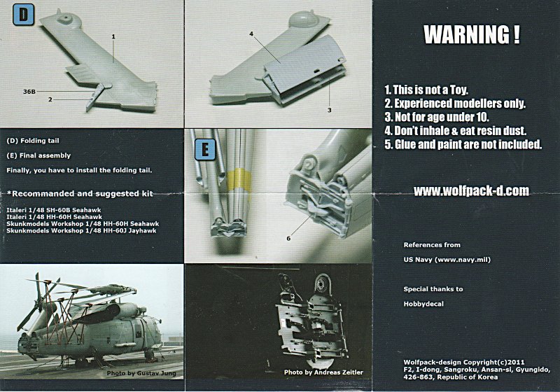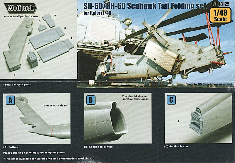 Der schon recht betagte Bausatz des SH-60 Sea Hawk von Italeri(Review) ist kürzlich in leicht abgewandelter Form auch von Skunkmodels Workshop als HH-60 erschienen. Daher nehmen sich auch die Chinesischen Zubehörhersteller dieses Bausatzes an. Neben einigen Figurensätzen von D-Toys biete nun Wolfpack Designs einen Detailsatz für die Abgeklappte darstellung des Heckrotors an.