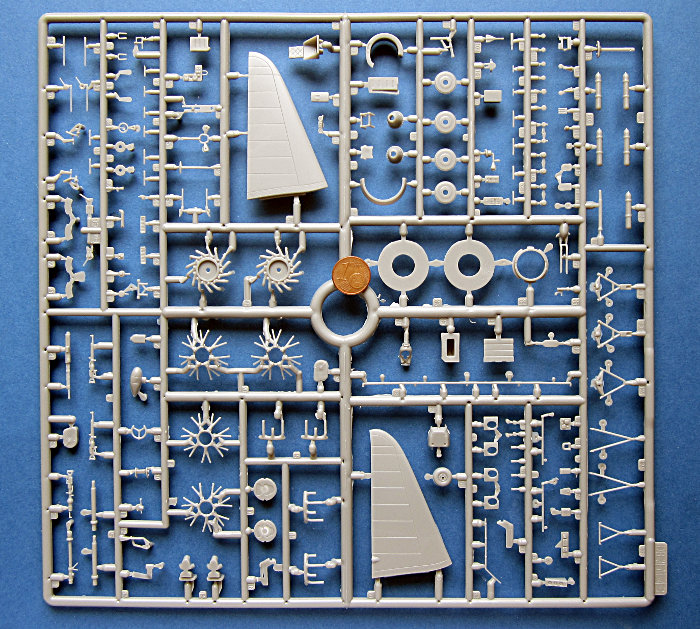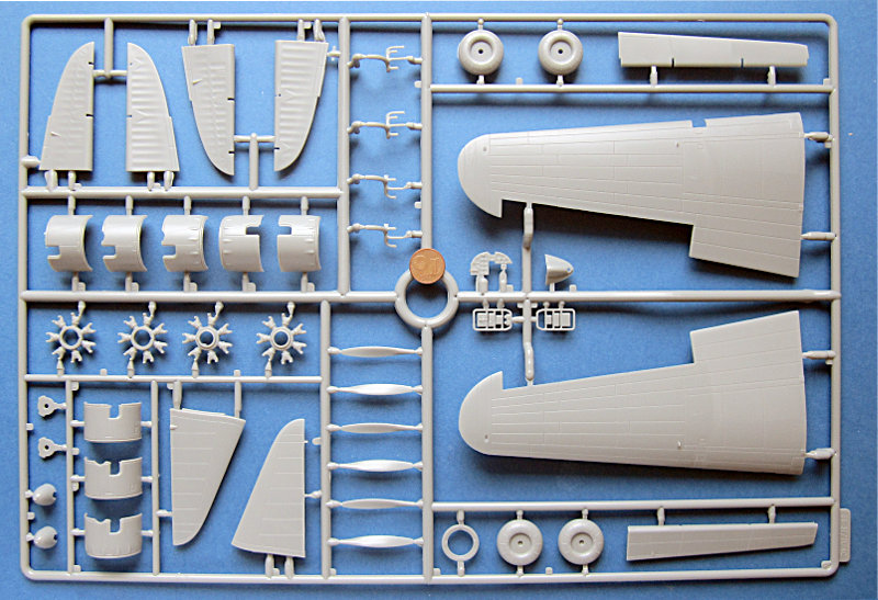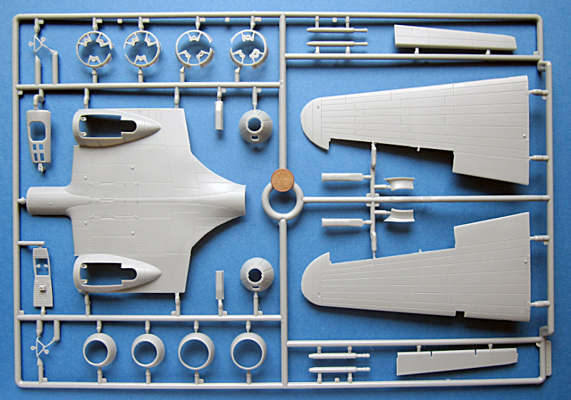 Die Plastikteile sind wirken recht stabil und weisen eine seiden-matte Oberfläche auf. Die Gravuren sind tief und vergleichsweise breit. Persönlich finde ich das nicht schlimm, insbesondere, da der Farbauftrag bei mir meist etwas stärker ausfällt. Allerdings ist dies nicht auf der Höhe der Zeit und nicht mit Tamiya, Revell, Hasegawa oder Eduard zu vergleichen. Die Darstellung der Stoffbespannung gefällt mir ganz gut, da sie recht dezent ist. Korrekt ist das aber sicher nicht, da man die Bespannung am Original nur wenig von der Blechbeplankung unterscheiden kann.