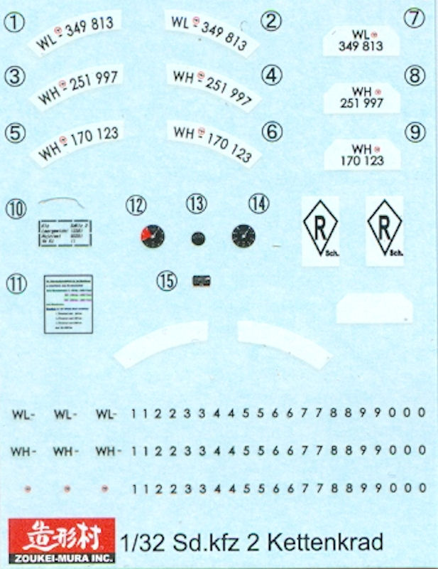 Clever ist die Darstellung der Kette an den geschlossenen Laufwerksteilen. Die Gummipads des Kette befinden sich vollständig an den äußeren Laufwerksteilen und überlappen die Kette des inneren Bauteils. Also keine lästigen Klebenähte in diesem Bereich! Einzig nicht so gut hat mir der Querschnitt des Pneus des großen Rades am Lenker gefallen,es fällt etwas eckig aus. Der Trägerfilm der Decals hat die berühmte „Shizuoka-Qualität“ Die kleinen Nummern für individuell wählbare Kennzeichen dürften bei Nichtgebrauch die 72er Flugzeugbauer begeistern (Werknummern!!)