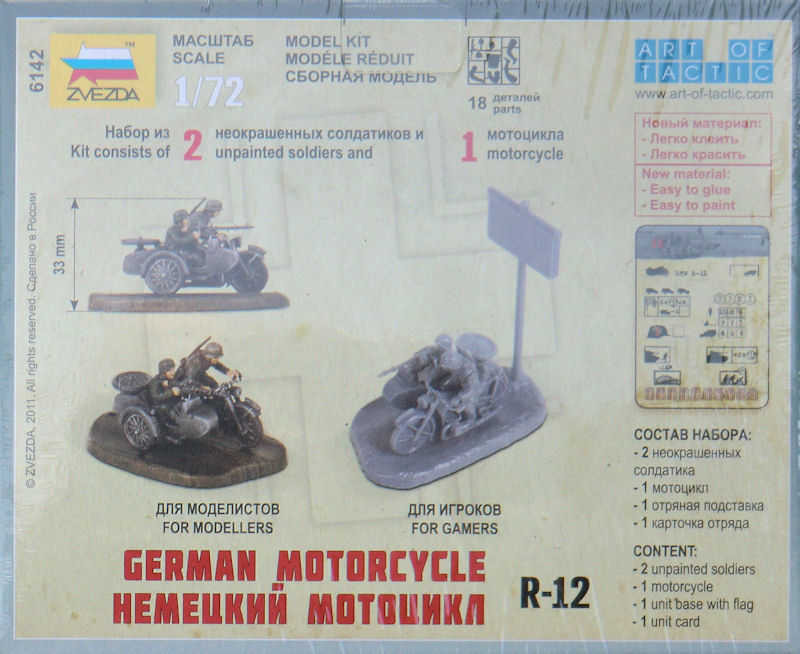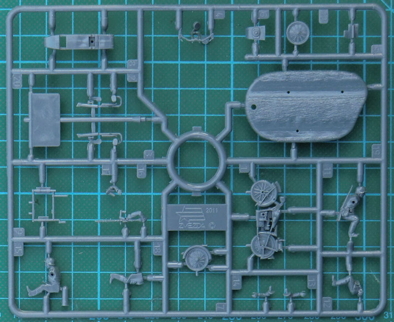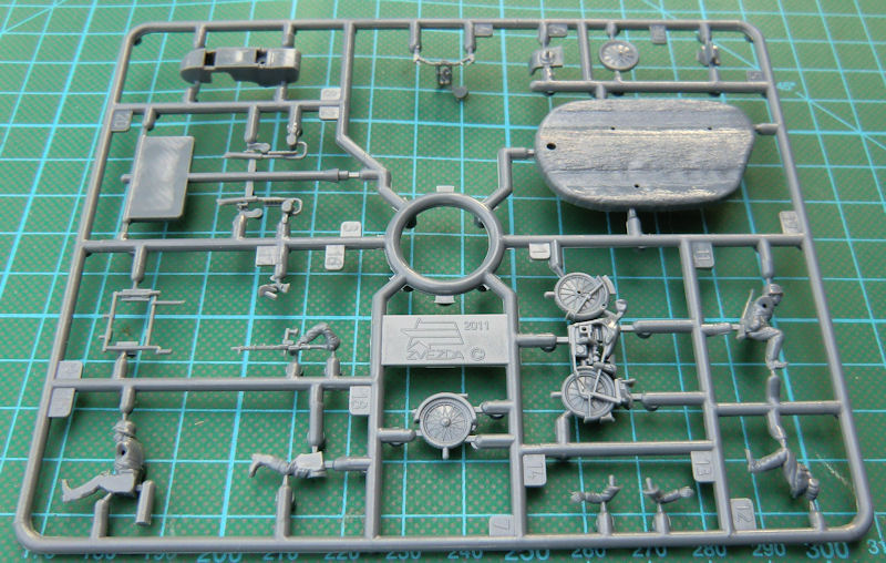 Bausatz: Es ist schon interessant was Zvezda in der Wargaming-Reihe „Operation Barbarossa“ für interessante Bausätze herausbringt. Diese sind natürlich auch für Modellbauer geeignet. In der kleinen attraktiven Schüttbox befinden sich neben der obligatorischen Spielkarte ein grauer Spritzling mit 20 Teilen und die Bauanleitung.