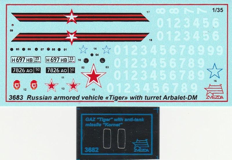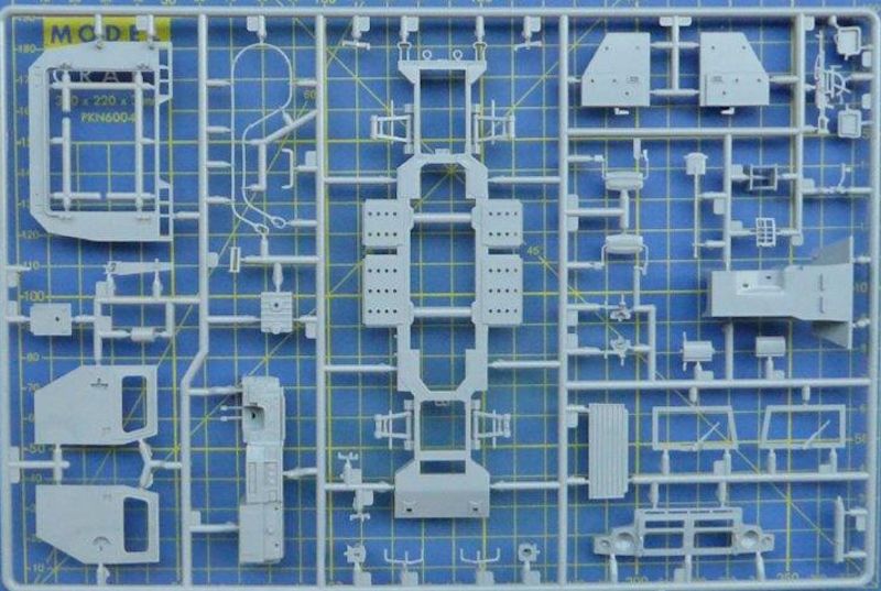 Bausatz: Dieser Bausatz liefert die dritte Variante des russischen Mehrweggeländewagens Tiger. Der Karton mit attraktivem Deckelbild enthält als Hauptverpackung eine wiederverschließbare stabile Pappschachtel. In dieser liegen sechs hellgraue und ein Spritzling aus Klarsichtmaterial mit Schlieren freien Fensterscheiben und diversen Glasteile für die Beleuchtungsanlage. Die Außenspiegel werden mit einer vorgestanzten beiliegenden Silberfolie beklebt.
