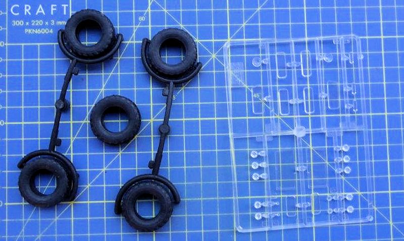 Für die Frontpartie liegt flexibles Gittermaterial bei. Dies wird mit einer in der Bauanleitung beiliegenden Schablone zugeschnitten. So wird der Kühlergrill perfekt wiedergegeben. Nicht zu vergessen sind die aus Vinyl gegossenen fünf Profilreifen. Diese sind gut detailliert, weisen aber mittig einen Gussgrat auf. Wem dies zu aufwendig ist, diesen zu entfernen greift auf den Zubehörhandel zurück.