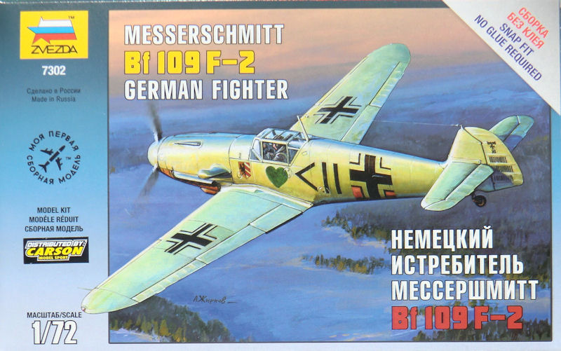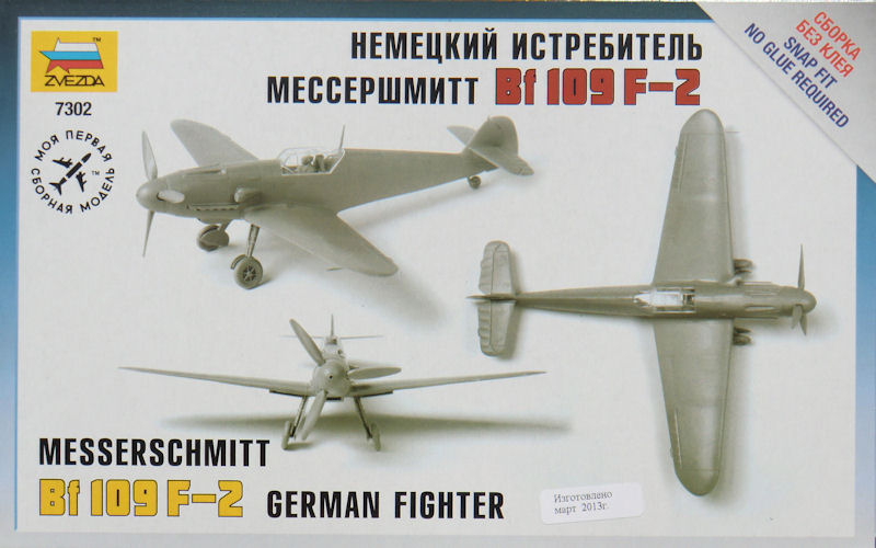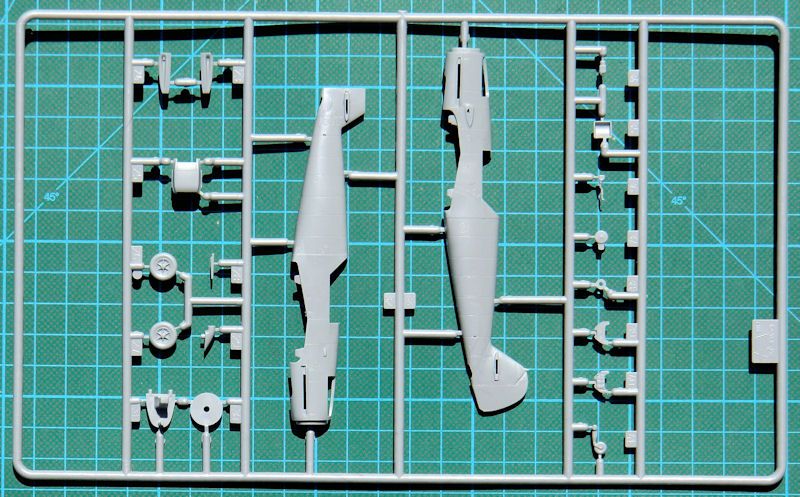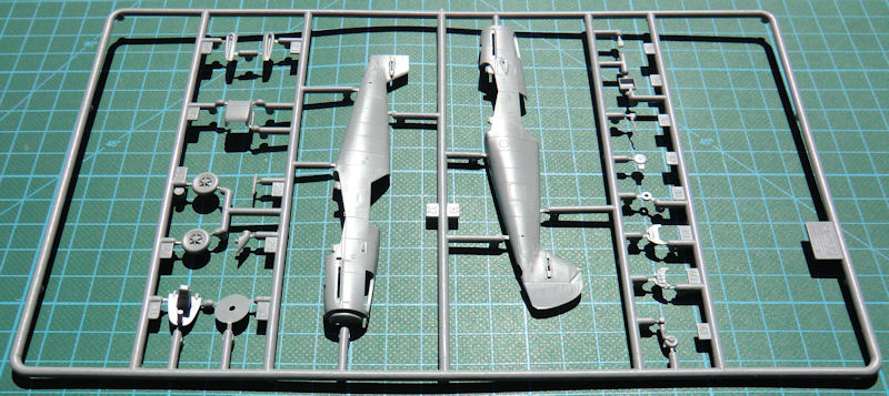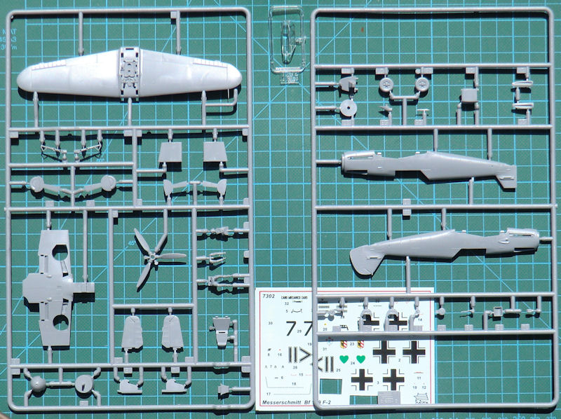 Bausatz: Zvezda hat vor einiger Zeit als zweiten Bausatz in der 72er Snap kit die Messerschmitt Bf 109F-2 herausgebracht. In der unpraktischen Schüttbox befinden sich zwei hellgraue Spritzlinge mit 41 Einzelteilen, eine Klarsichtkanzel, ein Decalbogen und die übersichtliche Bauanleitung. Es gibt feine versenkte Strukturen an. Leider gibt es auch Sinkstellen am Rumpf.