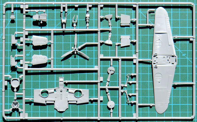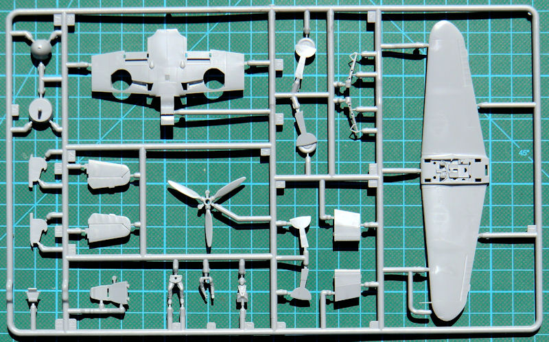 Die Einzelteile sehen sehr gut aus. Trotz der Zusammenfassung der Bauteile gibt es eine Menge Details. Fürs Cockpit gibt es auch einen Piloten der aus drei Teilen zusammengesetzt wird. Das Instrumentenbrett kann bemalt oder mittels Decal dekoriert werden.