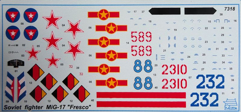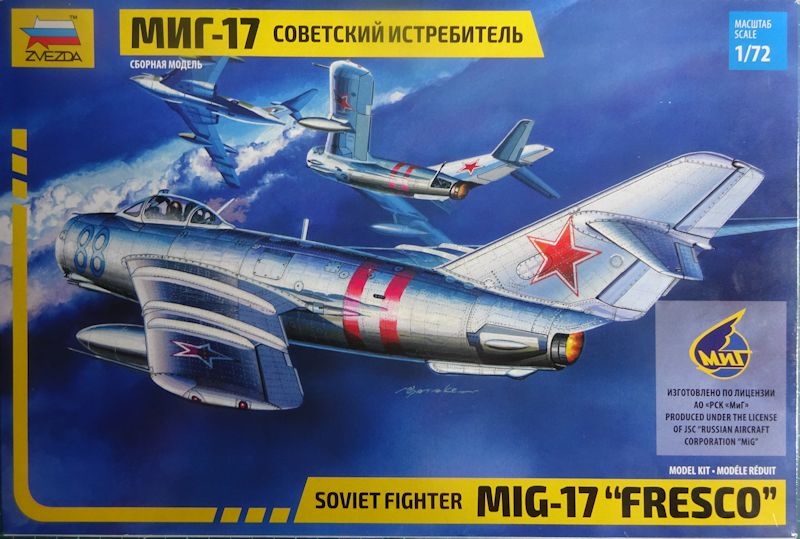 Bausatz: Der wiederaufgelegte Dragonbausatz von 1995 liefert das Modell der ersten, noch nachbrennerlosen, MiG-17. Der stabile Karton enthält zwei graue und einen Klarsichtast mit 45 Teilen. Einen Abziehbilderbogen und die Bauanleitung. Die Ausführung der Einzelteile und Gravuren ist ansprechend. An einigen kleinen Sinkstellen merkt man aber das Alter der Formen. Der Schleudersitz besteht aus drei Teilen, die Instrumente werden als Abziehbild geliefert. Die Rumpfaufteilung legt nahe das weitere Versionen folgen sollten (aber nie folgten). Der Bau selbst dürfte keine Probleme machen und somit auch für Einsteiger eine Option sein.
