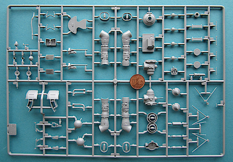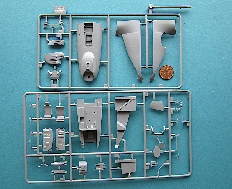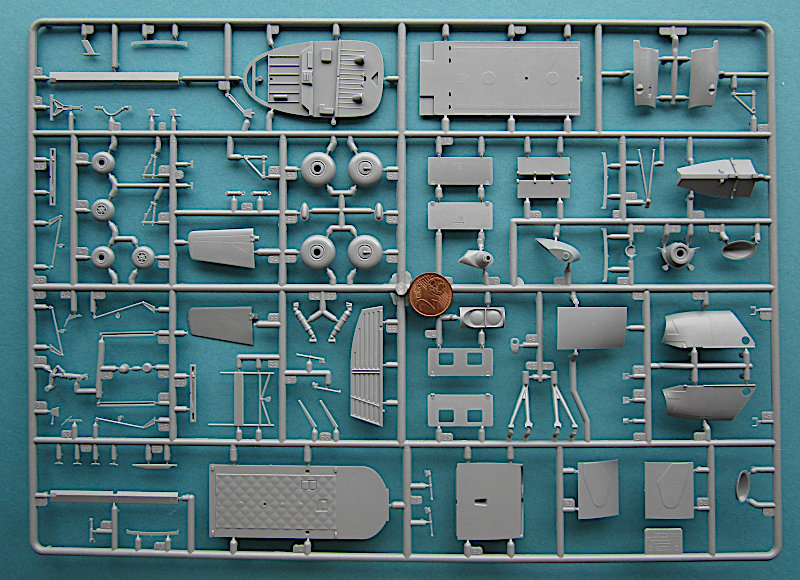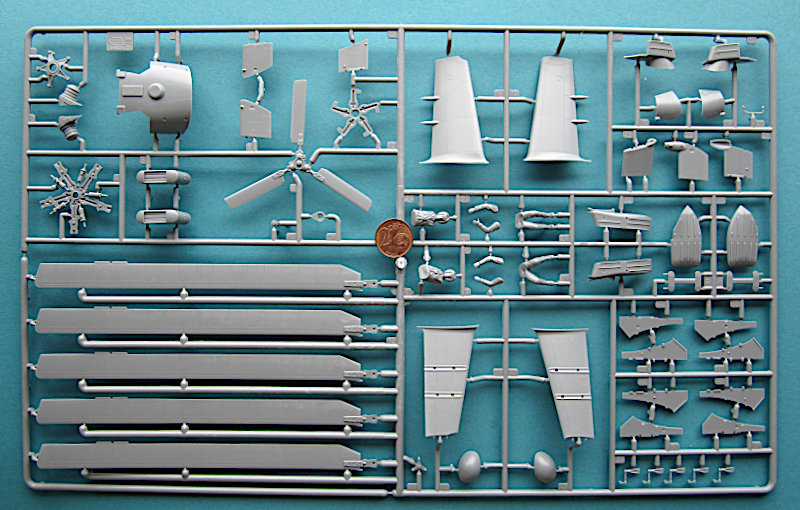 Nachdem wir nun die größten Kritikpunkte abgehandelt haben, kommen wir zum Bausatz. In der stabilen Faltbox mit nach oben zu öffnendem Deckel finden sich 7 Graue und zwei klare Spritzlinge. Aus der Aufteilung wird deutlich, dass es noch mindestens einen weiteren klaren und einen grauen Gießrahmen geben wird, um die Varianten A, D, P und vielleicht Mi-35 darzustellen. Dementsprechend ist auch die Aufteilung des Bausatzes zu verstehen, das Heck bis einschließlich Kabine für die Infanteristen sind zwei Rumpfschalen, an die vorn der mehrteilige Aufbau für den Piloten und Co-Piloten montiert wird. Wie bereits erwähnt ist die Außenhaut sehr glatt und mit sehr feinen, flachen Gravuren versehen. Gegebenenfalls sollte man diese vorsichtig nachziehen. Übrigens ist in der Verpackung jede Menge Platz für Zubehörteile, da der Bausatz nur etwa zwei Drittel des Raumes einnimmt.