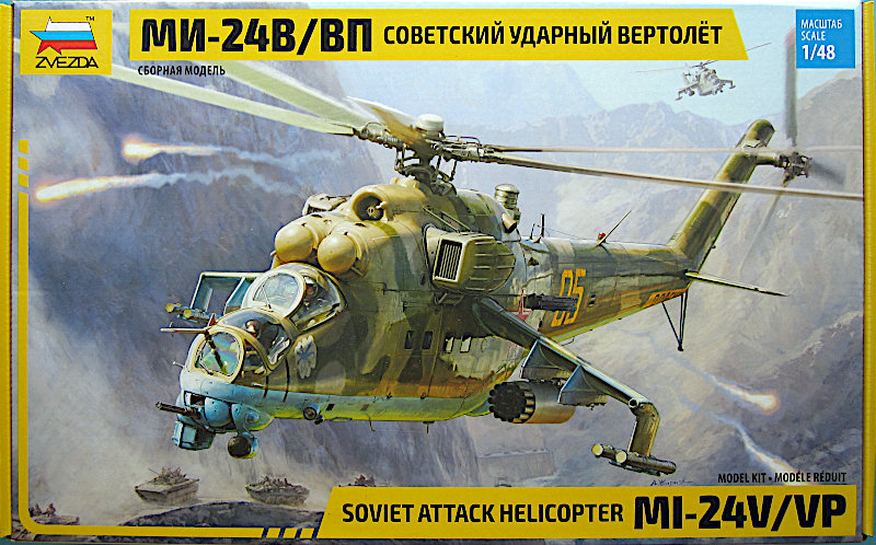 Bausatz: Wie die MiG-21 gehörte für mich der Mi-24 zum Alltagsbild meiner Kindheit im Norden der DDR. Außerdem ging es in den Ferien oft genug an Basepohl oder Trollenhagen vorbei zu den Großeltern. Sehr lange Zeit war der Bausatz von Monogram der einzige in 1/48, um diesen wohl bekanntesten Hubschrauber der Warschauer Vertrags in 1/48 nachzubilden. Erhabene Gravuren und das Alter der Form mit den damit einhergehenden Nachteilen in der Formtreue hielten mich davon ab, das Bausatz zu kaufen geschweige denn zu bauen. Nun gibt es von Zvezda endlich einen zeitgemäßen Mi-24. Dieser kommt zunächst in der Variante Mi-24W bzw. WP heraus. Nicht so super für mich, denn mich interessieren eher die Varianten Mi-24D und P aber dennoch ein guter Einstieg in die Serie.