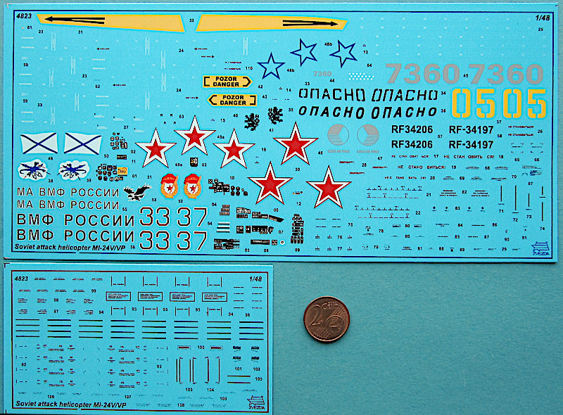 Dieser letzte Umstand ist auch ein kleiner Nachteil des Bausatzes. Zvezda hat nämlich aus zweierlei gründen auf die Nachbildung der Nieten am Hubschrauber verzichtet: einerseits um Kosten zu sparen und andererseits, weil sich diese in den Varianten unterschieden. Mi-24W/WP hatten z.B. Verstärkungen in den Heckausleger eingebaut. Hier kann man nur hoffen, dass HGW oder auch ein anderer Anbieter sich des Problems annimmt. Der Hubschrauber mag auf vielen Fotos glatt wirken, ist aber mit unzähligen erhabenen Nieten versehen. Ein zweiter großer Nachteil der Sparpolitik sind die völlig glatten Instrumentenbretter, deren Instrumente und Schaltbretter mittels Decals nachgestellt werden sollen. Das ist für 1/48 armselig und eigentlich nicht tragbar, insbesondere, da der Bausatz hierzulande mit etwa 40 Euro zu Buche schlägt. Sören hat mich auf ein Produkt der Firma Quinta Studios aufmerksam gemacht, das ich absolut überzeugend finde und separat vorstelle. Es schlägt allerdings nochmal mit ca. 20-25 Euro zu Buche. Auch Eduard hat bereits 7 Sets für Juli angekündigt, darunter auch ein Löök-Set … ich kann mir allerdings nicht vorstellen, dass es für die beiden Cockpits deutlich günstiger ausfallen wird. Aber das bleibt abzuwarten.