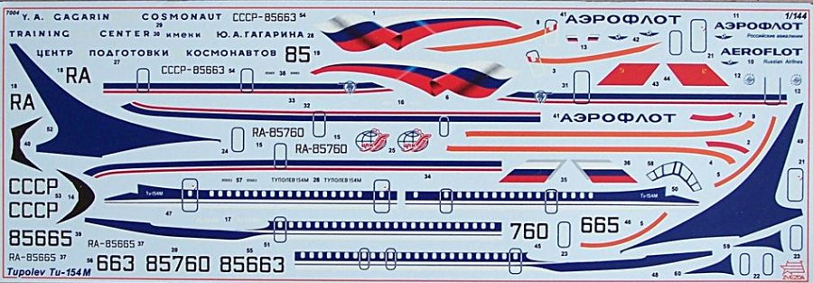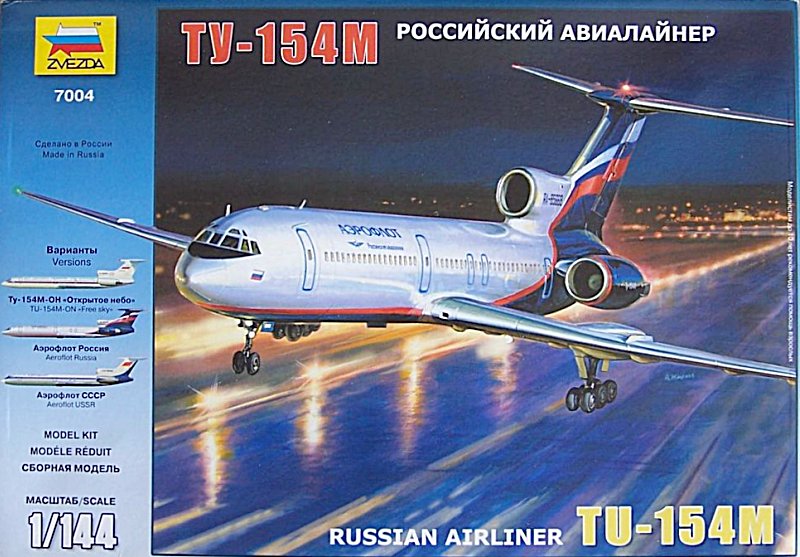 Vorbild: Die Tupolew Tu-154 (NATO-Codename: Careless) ist ein dreistrahliges Verkehrsflugzeug mittlerer Reichweite für 150 bis 180 Passagiere des russischen Flugzeugherstellers Tupolew PSC. Da mehr als 1000 Maschinen gebaut wurden, die in der Variante Tu-154M auch die gegenwärtigen europäischen Lärmrichtlinien Kategorie 3 erfüllen, werden die Maschinen wahrscheinlich noch lange im Einsatz sein. Sie wird oft mit der B727 von Boeing verglichen, hat aber viel weiter reichende Aufgaben zu erfüllen und ist wesentlich robuster konstruiert, eben auch für den Einsatz auf unwirtlichen Pisten. Dies ging bewusst zu Lasten der Wirtschaftlichkeit, was dann letztlich ihr Ende einläutete.