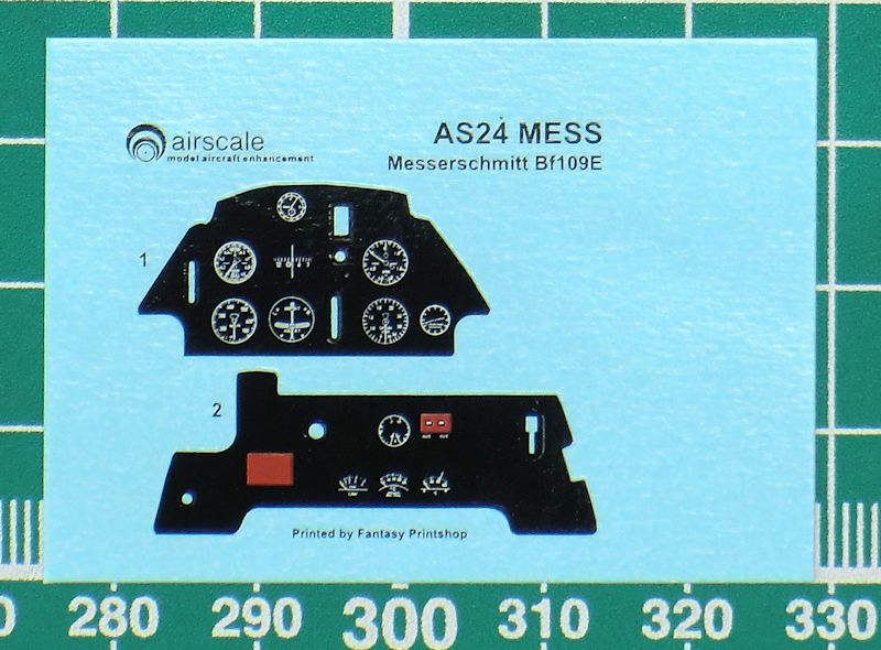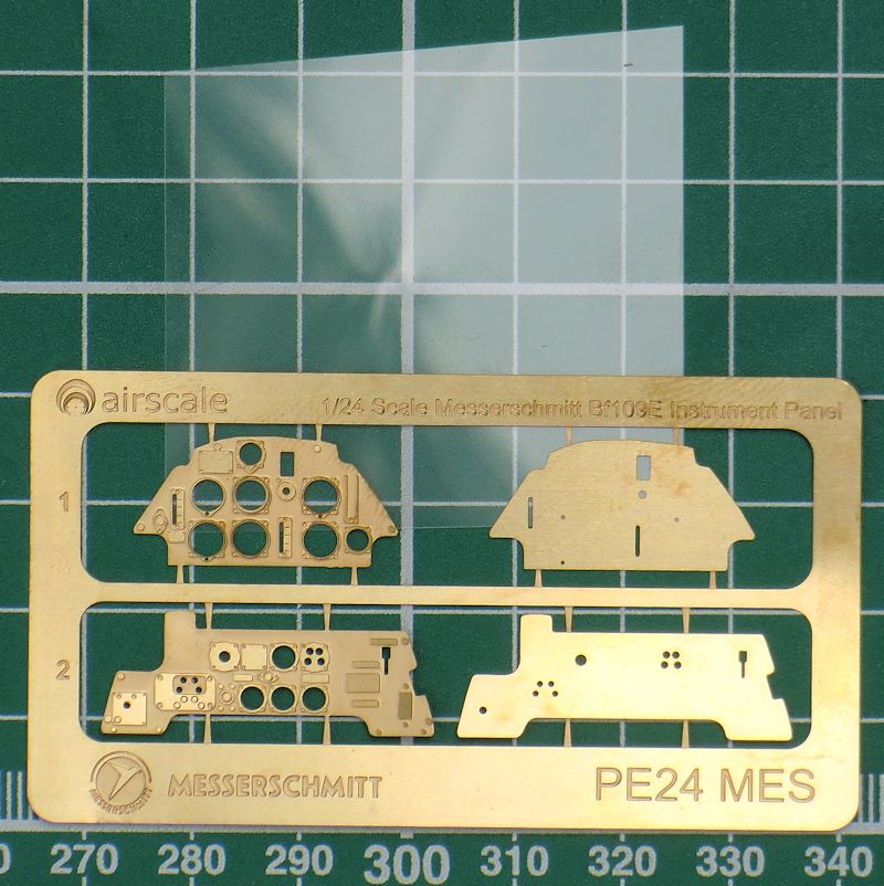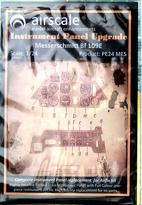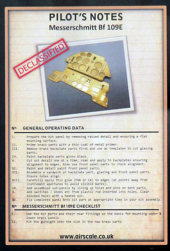 Für die Messerschmitt Bf 109E von Airfix in 1/24 gibt es von airscale ein Instrumentenbrett. In der Zipptüte befinden sich einen Ätzplatine, ein Decalfilm, eine Klarsichtfolie und die kleine Bauanleitung.
