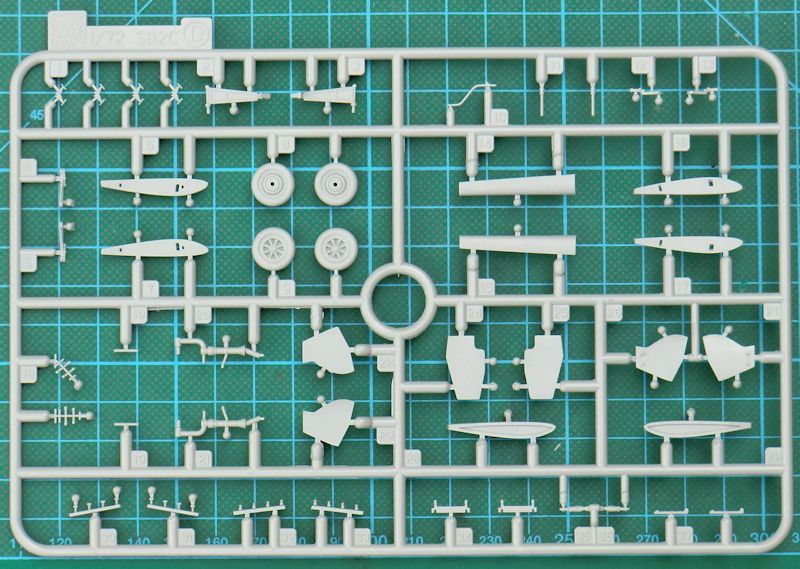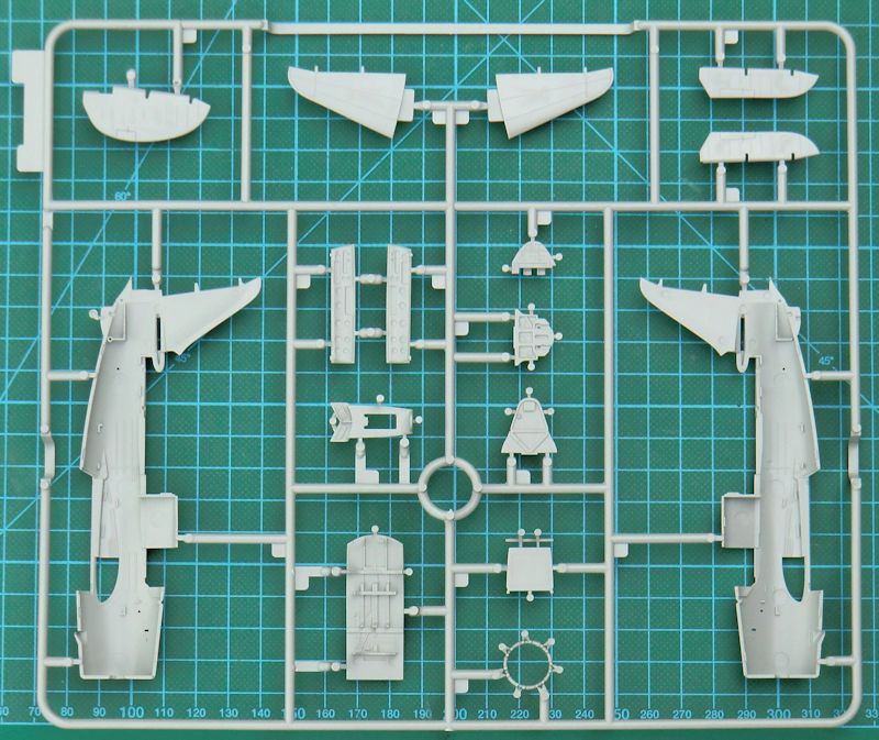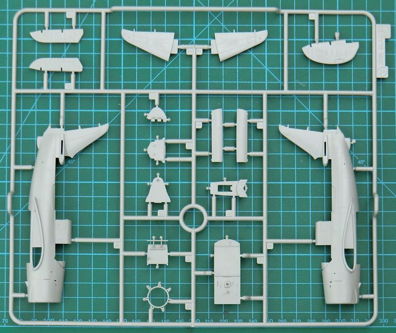 Bausatz: Nach der SB2C-4 und der SB2C-3 von cyber-hobby folgte jetzt die Army-Version A-25A Shrike in 1/72. In einem etwas zu großen Stülpkarton befinden sich gut verpackt fünf hellgraue Spritzlinge mit 144 (!) Teilen, zwei Klarsichtrahmen mit sechs Teilen, einen Fotoätzteilbogen, die Decals und die Bauanleitung. Ein paar Teile sind für die Navy-Versionen und landen in der Restekiste.