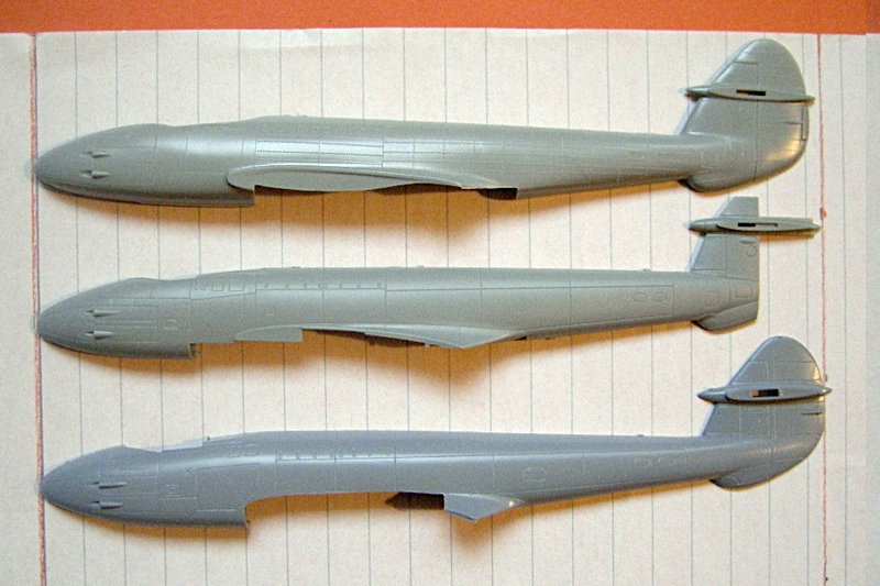Beim Vergleich der Länge ergibt sich bei allen eine geringe Abweichung von der Norm, die aber nicht ins Gewicht fällt. Anders sieht es bei den Tragflächen aus. Während Airfix und MPM hier bis auf kleine Maßabweichungen übereinstimmen, weicht hier das Dragonmodell ab. Dessen Flügel fallen zu spitz aus. Beim Durchmesser der Triebwerken gibt es die größten Unstimmigkeiten: MPM=14mm, Airfix=15,5mm und Dragon=17mm. Hier überzeugt das Airfixmodell.