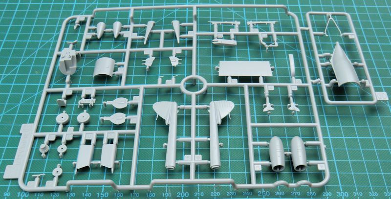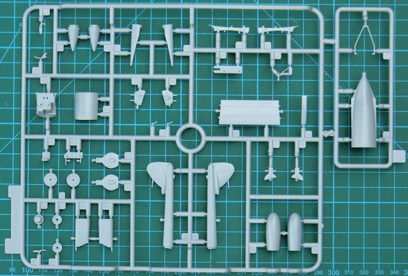 Das Hauptfahrwerk sieht recht ordentlich aus. Das gilt insbesondere auch für die Fahrwerksklappen. Aber die Hauptfahrwerksräder sind etwas platt. Als Option gibt es zwei Zusatztanks für die Tragflächenunterseiten. Die Haube kann optional offen angeklebt werden.