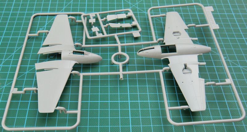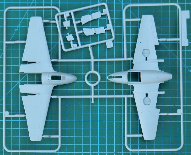 Das Cockpit entsteht aus drei Teilen. So gibt es eine schön strukturierte Wanne mit Instrumentenbrett und weiteren Details. Allerdings vermisse ich ein ordentliches Decal für die Instrumente. 2,5 Gramm sollen als Gegengewicht im Bug reichen. Die Konstruktion mit Ober- und Unterschale samt Fläche ist gut gemacht. Die charakteristische Heckform der Sea Vampire F.20 ist gut getroffen. Es gibt ein zwei tiefere Lufteinläufe. Das Höhenleitwerk besteht aus einem Stück. Bei den beiden Leitwerksträgern ist es auch jeweils so. Diese müssen auf der Tragfläche ausgerichtet werden.