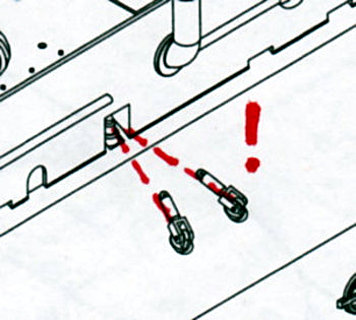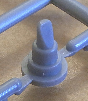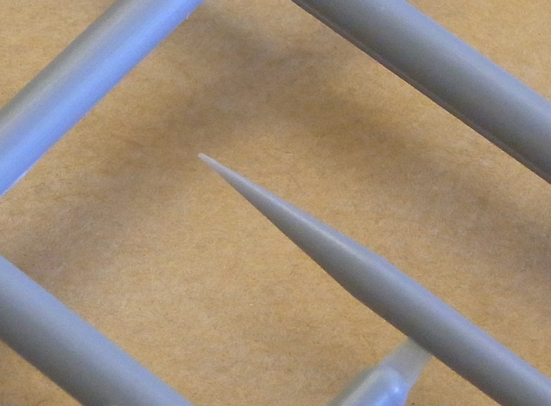 Bei Merit müsste man gar nicht erst drehen, da die Streben gar keine Verbindung zum Rumpf und den Halteschrauben haben (Abb. 1)! Da hat irgendjemand so gar nicht nachgedacht. Das Problem lässt sich aber leicht beheben. Man muss nur die an den Minen anzuklebenden Halterungen so mit Rundmaterial verlängern, dass sie an die Schrauben in ihren Aussparungen heranreichen (Abb. 2) und diese dort ebenfalls festkleben. Wie genau das aussehen muss, ist nicht so eindeutig. In jedem Fall müssen auch an diesen Enden Halteklauen ergänzt werden. Dafür liefert Merit immerhin die Vorlage.