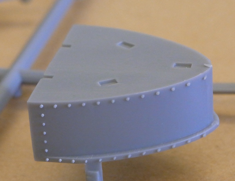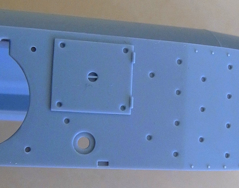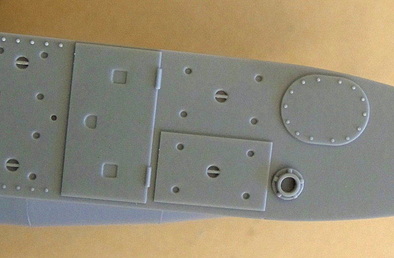 Die Bauteile weisen diverse versenkte "Löcher" auf, die beim Vorbild natürlich der Entlüftung der darunter liegenden Hohlräume dienten. Man sollte sich daher die nicht allzu große Mühe machen und die "Löcher" aufbohren. Sieht sicher besser aus. Auch unten am Bug befinden sich solche "Löcher". Diese sind aber eher oval, was natürlich mit der Entformbarkeit der Rumpfhälften zu tun hat. Hier ist es mit dem Bohren alleine nicht getan. Am besten füllt man die ovalen Löcher erst mit Sekundenkleber und bohrt sie dann neu.