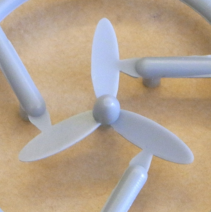 Meines Wissens waren die Propeller aus Stahl und nicht aus Gelbmetall und die Schäfte der Ausfahrgeräte waren sicher aus poliertem Stahl und selbst mit Ölschicht eher silbrig. Die Hauptaufgabe wird es aber sein, den monotonen, grauen Anstrich lebendig zu gestallten.