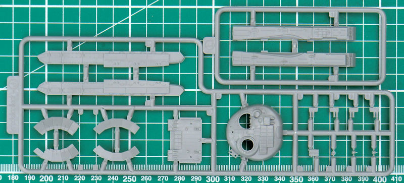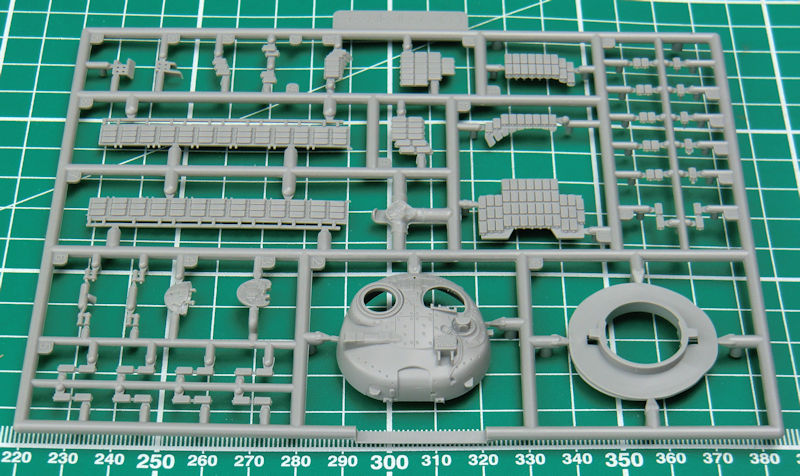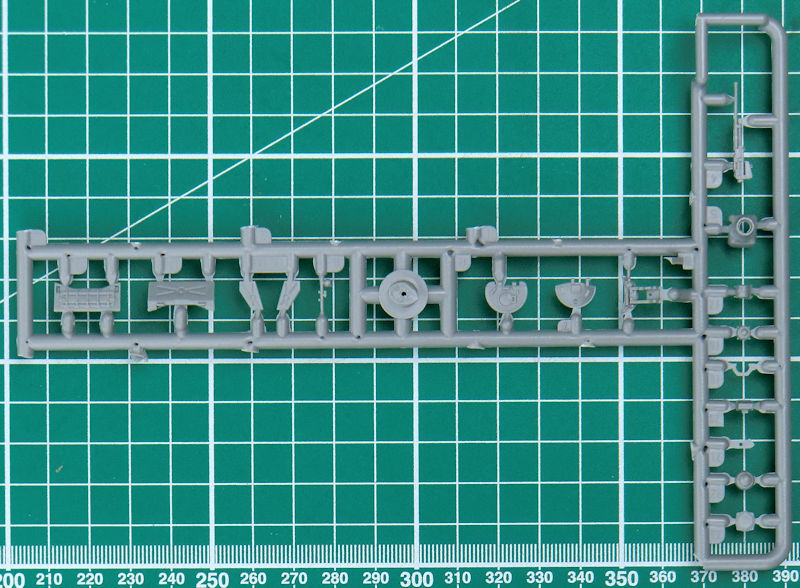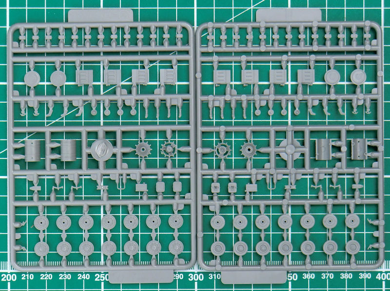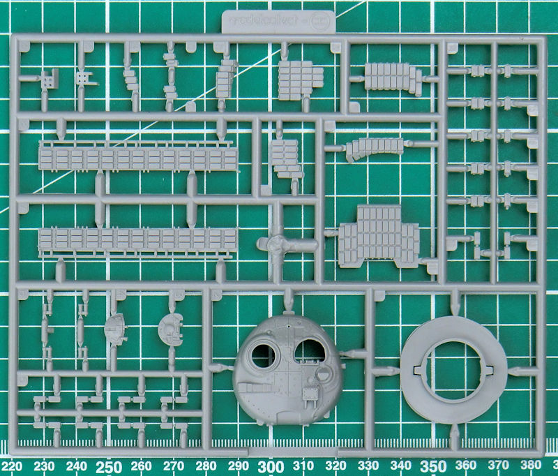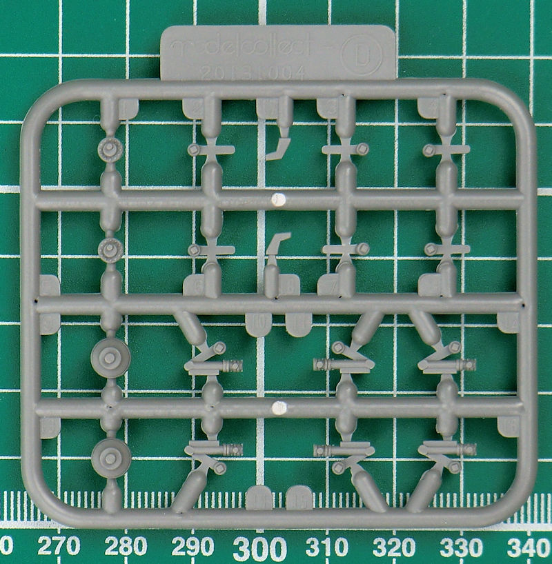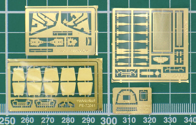 In dem attraktiven Stülpkarton befinden sich gut verpackt elf graue Spritzlinge oder Großbauteile mit 302 Teilen, vier Fotoätzteilbögen, ein gedrehtes Metallrohr, zwei universelle Decalbögen und die mehrfarbige Bau- und Bemalungsanleitung. Weiterhin gibt es einen Beipackzettel der das Verbauen der Fotoätzteile zeigt. Einige Teile sind für andere Varianten und wandern in die Restekiste.