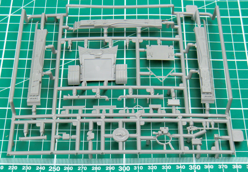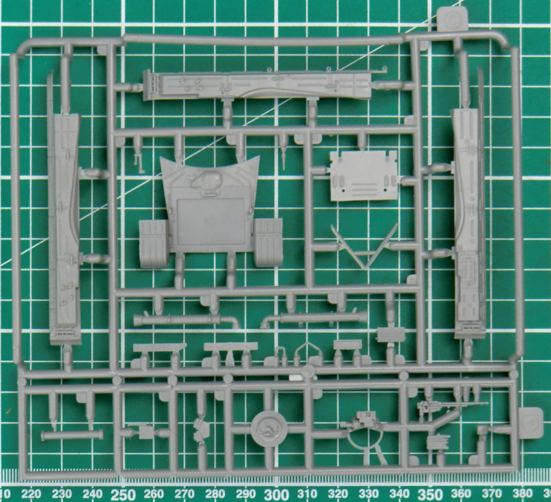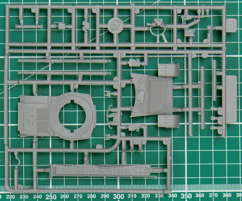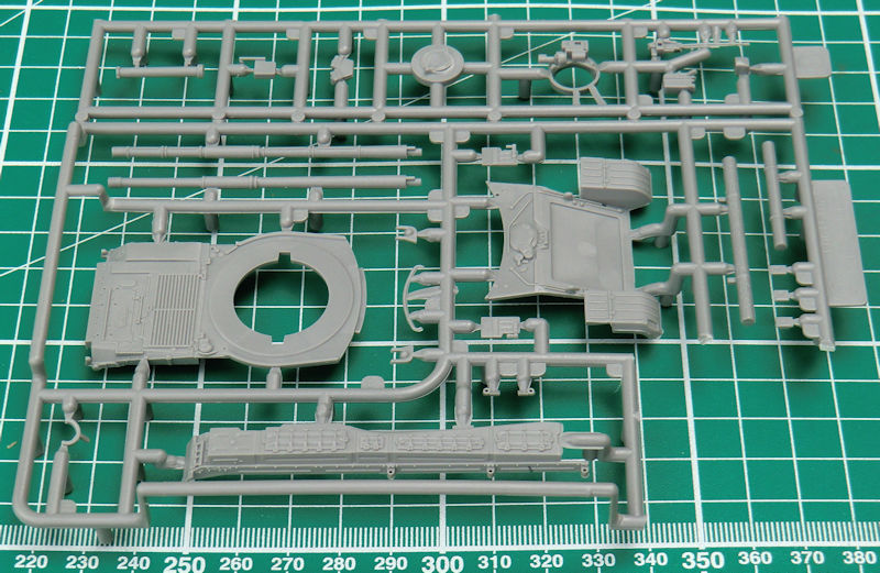 Die Wanne besteht aus Kunststoff und hier werden die Schwingarme separat angebaut. Dadurch wird das Fahrwerk sehr filigran. Die Segmentketten sind schön auch von innen detailliert. Das Wannenoberteil wird gestückelt. Bei der Endmontage kommen noch die neuen komplexen Seitenschürzen hinzu. Die obligatorische Stange bzw. das nachgebildete Rundholz im Heck darf natürlich nicht fehlen.
