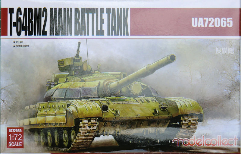 Bausatz: Vor kurzem setzte modelcollect die Reihe der T-64-Kampfpanzer im Maßstab 1/72 fort. So erschien auch der T-64BM2 Bulat. Auf dem attraktiven Cover wird auf vorhandene Fotoätzteile und ein Metallrohr hingewiesen. Auf eine Angabe der Teilezahl hat man nun verzichtet.