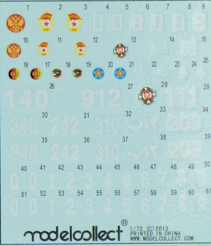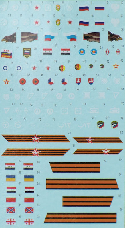 Es gibt hier schöne Bemalungsvarianten zweier nicht näher bezeichneten Vorbilder. Die Farbhinweise sind für das System von mig. Die beiden Universaldecalbögen sind tadellos auf hellblauem Trägerpapier gedruckt.