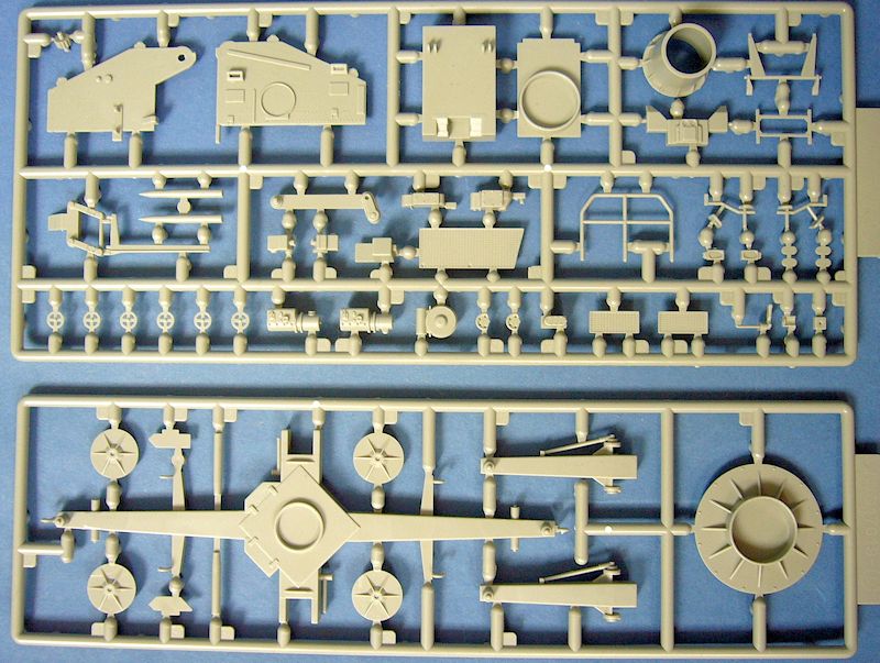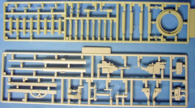 In einem stabilen Karton mit dem Geschütz auf dem Deckelbild finden sich vier graugrüne Gussäste mit allen wesentlichen Teilen zum Bau der Flak. Als Basis liegt eine Kreuzlafette bei, wie sie auch von der 8,8cm und 10,5cm Flak bekannt ist. Tatsächlich existierte diese Version auch am Anfang der Entwicklung, jedoch musste man relativ schnell feststellen, dass das Design den gewaltigen Rückstoßkräften nicht gewachsen war, weshalb eine stabilere Lafette mit einer rechteckigen Grundplatte und vier nach außen klappbaren Stabilisatoren entwickelt wurde.