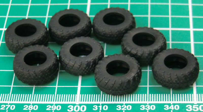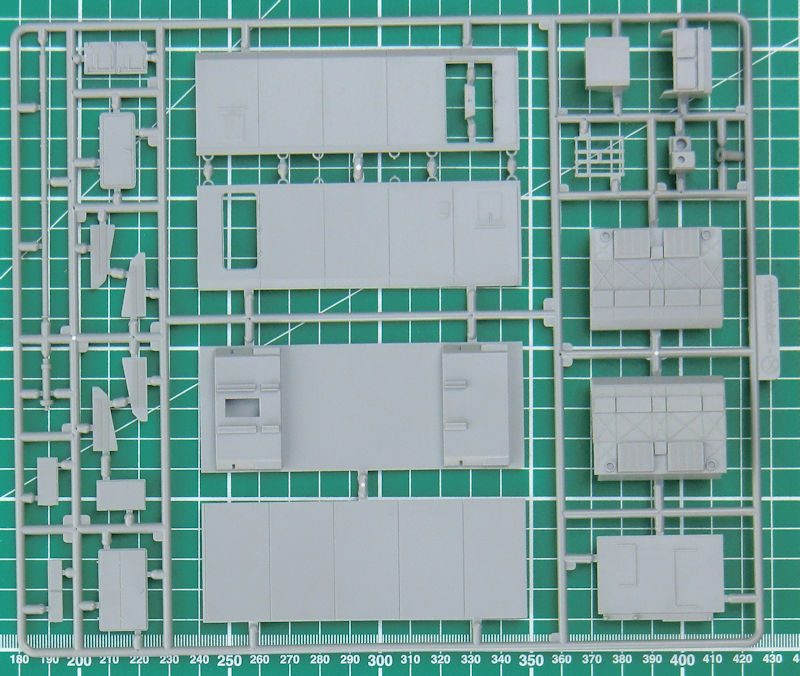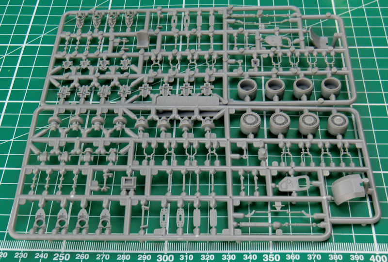 Die acht großen Gummireifen werden auf acht einteilige Felgen aus Spritzgussmaterial aufgezogen. Keinesfalls darf man dabei Klebstoff einsetzen und man sollte die Felgen zuvor lackiert haben. Der große Koffer ist innen leider komplett leer. Allerdings sind die Türen einzeln vorhanden. Falls es jemanden noch nicht reicht, dann kann er hier noch nachlegen, sofern man verwertbares Material für den Innenraum findet.