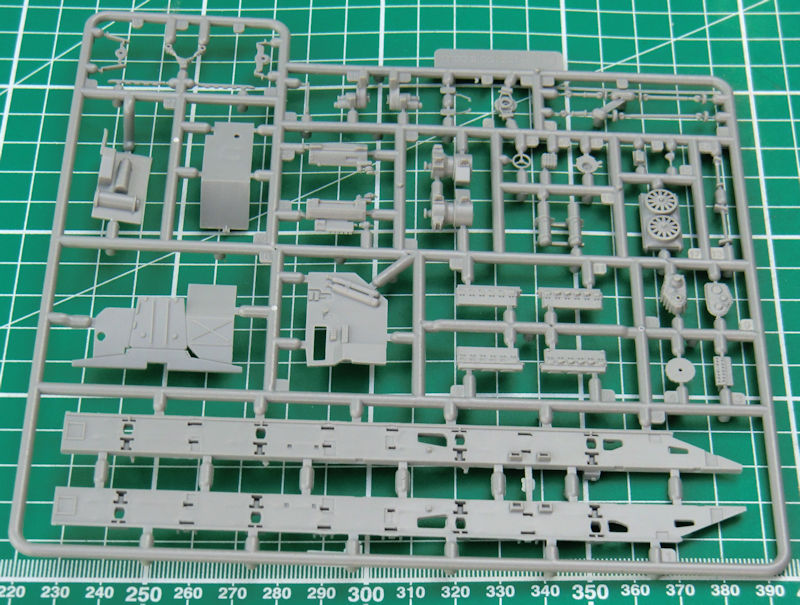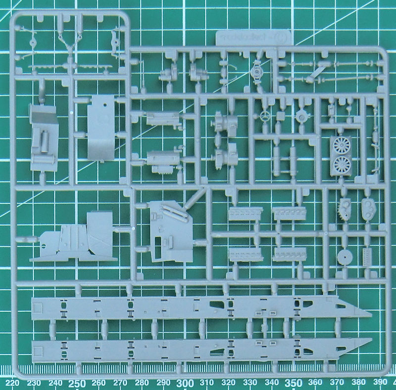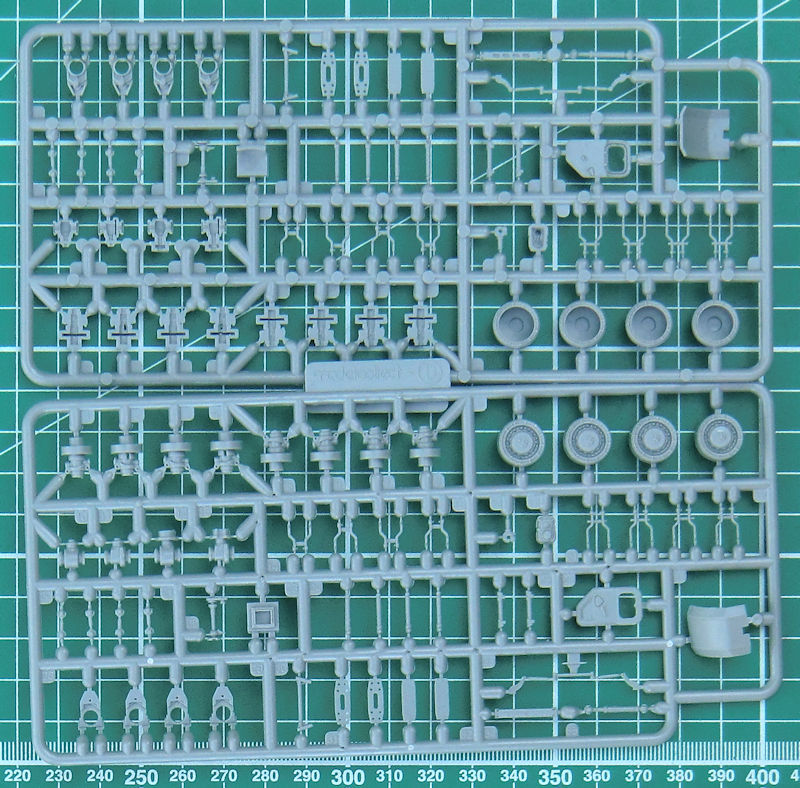 Die Abspritzung der Bauteile ist voll auf dem hohem Niveau des Herstellers. Der Zusammenbau wird auf 18 Bauabschnitten gezeigt. Man beginnt mit einer schönen Motornachbildung samt Kühler. Dann folgt das sehr detaillierte Fahrwerk. Das ist auf jeden Fall eine Fleißarbeit. Leider hat modelcollect auch noch die Radnarben geteilt… Leider ist von der Fahrzeugunterseite nach dem Zusammenbau nur noch wenig zu sehen.