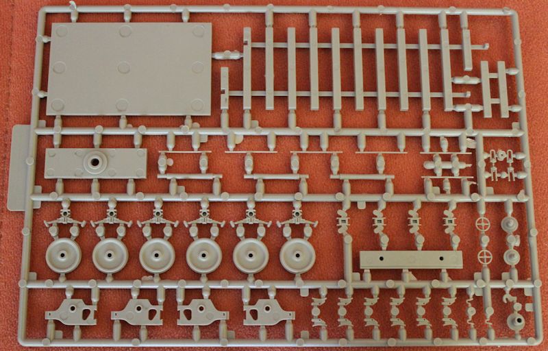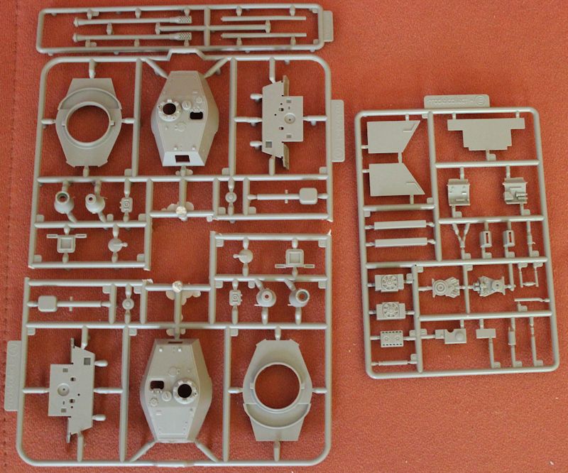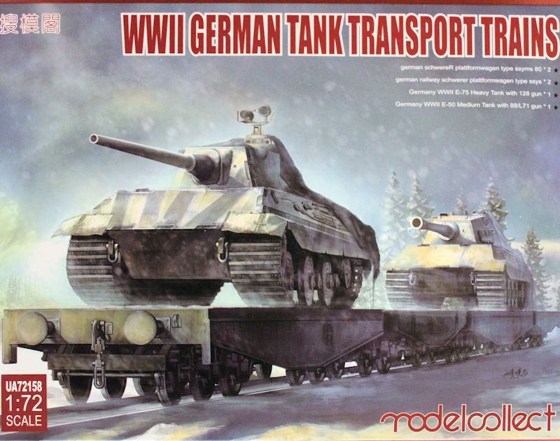 Bausatz: Aus dem Kasten kann man vier Flachbettwagen und zwei Panzer bauen. Der E-50 und E-75 sind die bekannten Modelle von Modelcollect. Der gut gestaltete Karton ist bis obenhin mit Insgesamt 33 hellgrauen Gießästen, der Bauanleitung, sechs Abziehbilderbögen und sechs kleinen Fotoätzplatinen gefüllt.