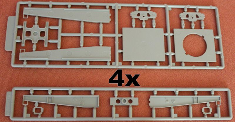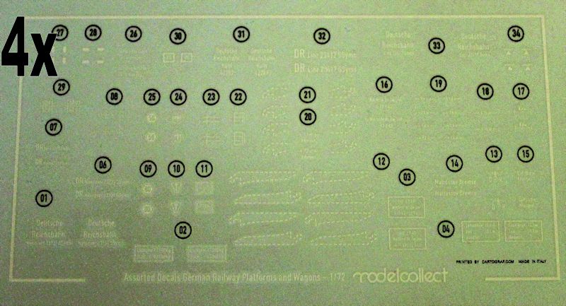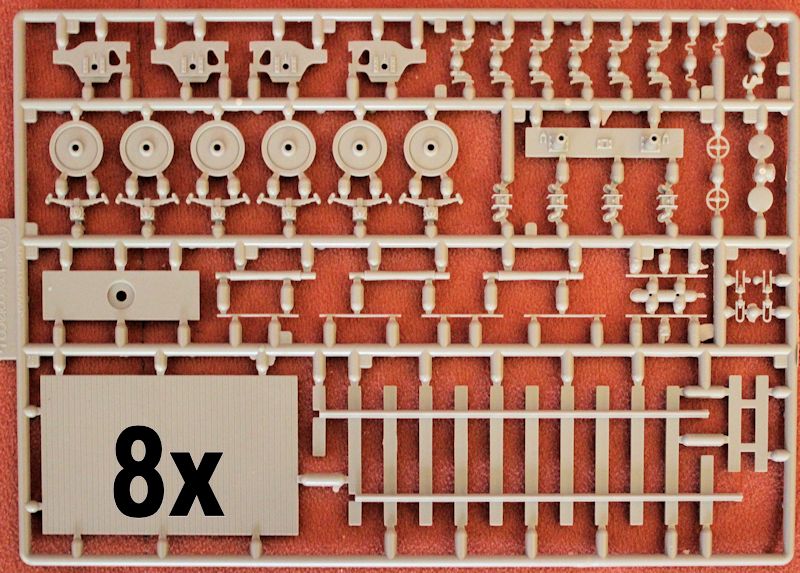 Davon entfallen 16 Gießäste auf die Flachbettwagen. Für jeden Wagen liegt ein gut gestalteter und sauber gedruckter Decalbogen bei. Es können zwei verschiedene Flachbettwagen gebaut werden zum einen der Vier- und zum anderen der Sechsachser.