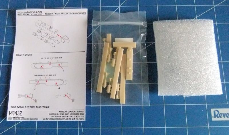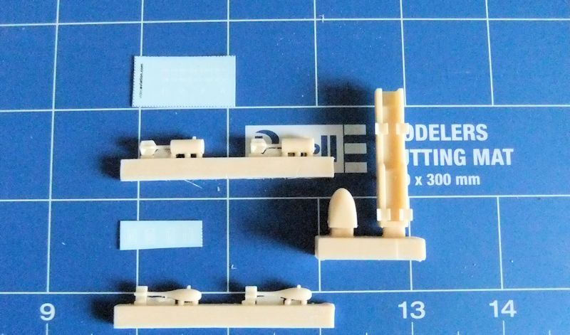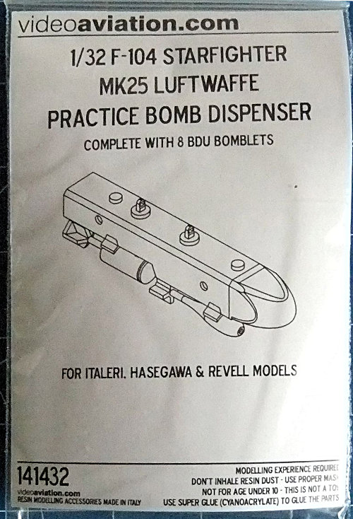 Bausatz: Diese Einheit ist für den F-104 G Starfighter, besonders für die von der Bundesluftwaffe geflogenen Maschinen gedacht. Wieder einmal bietet Videoaviation.com ein schön detailliertes Waffenzubehörset an, welches kritiklos an den großen Starfightermodellen verwendet werden kann. Alle Teile sind auch hier aus ockerfarbigen Resinmaterial gefertigt. Ein kleiner Decalbogen für die Beschriftungen ist dem Set beigegeben.