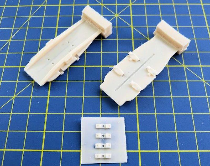 Die durchsichtige Klapp box beinhaltet zwei Stück dieses Bombenträgers. Zusätzlich liegen der Schachtel noch die Aufhängungspunkte für die Tragfläche bei. Diese sind in einer Resinplatte gegossen worden und aus dieser zu entfernen. Dies sollte aber kein Problem darrstellen. Auch die Bombenträger gilt es, mit Hilfe einer Modellbausäge von den Angüssen zu befreien. Der Resinguss ist gut gelungen. Eine kleine Bauanleitung unterstützt beim Zusammenbau. Farbangaben fehlen.