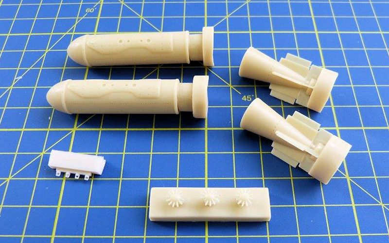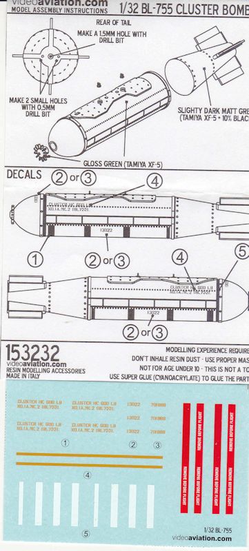 Dieses Zubehörset enthält zwei Bombenkörper. Der Heckbereich der Bombe mit den Stabilisatoren liegt separat bei. Des Weiteren liegen Zünder und Aufhängungsösen bei. Angüsse gilt es bei Resinbausätzen immer zu entfernen. Der Resinguss ist gut gelungen und blasenfrei ausgeführt. Auch hier liegt eine kleine Bauanleitung zur Unterstützung des Zusammenbaus bei. Auf ihr befinden sich auch Farbangaben. Ein kleiner Decalbogen zur Markierung der BL-755 darf auch nicht fehlen.